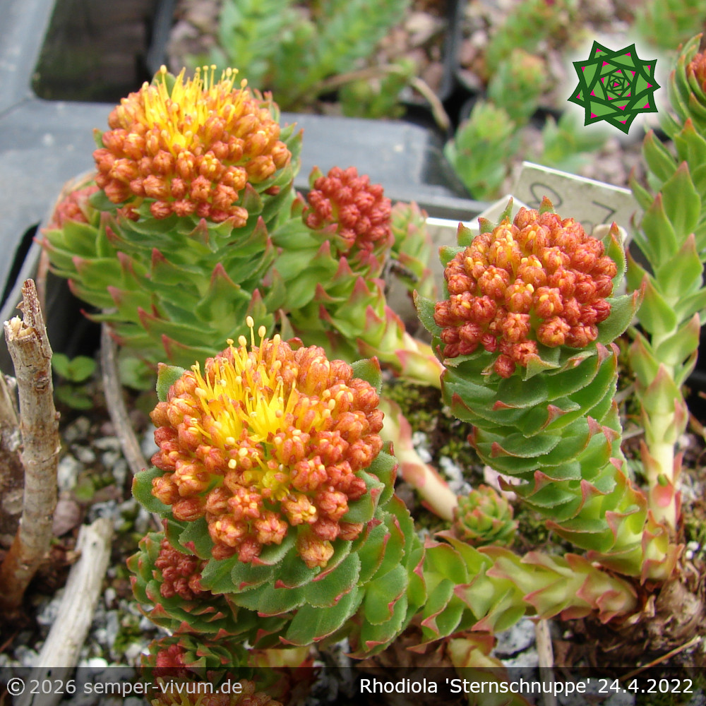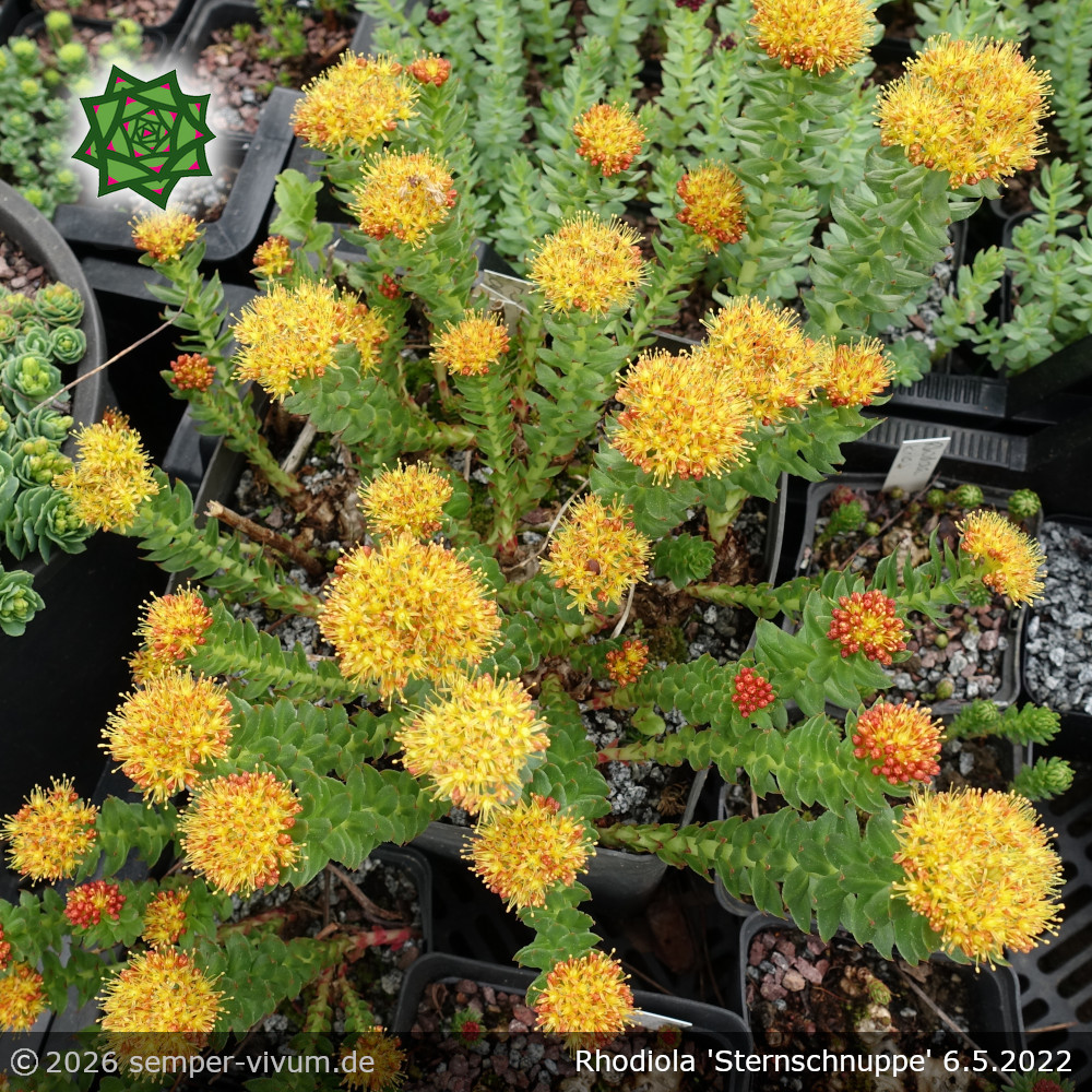Es ist der schönste Zufallssämling in unserer Sammlung. Unsere Hummeln und Bienen waren sehr beschäftigt, verschiedenste Arten der Rosenwurz zu besuchen und zu bestäuben. Eine botanische Zuordnung war uns nicht möglich, da es sich um eine Hybride handelt. Diese mehrjährige Staude öffnet bereits Ende April viele Knospen und schmückt sich dann mit orangegelben Blütenbällen. Das Laub ist dunkelgrün und leicht glänzend. Die oberirdischen Pflanzenteile sterben im Herbst komplett ab, wobei sie dann im Frühjahr neu austreiben. Den Sämling hatten wir jetzt schon über 15 Jahre in Vermehrung und er wurde vegetativ (durch Teilung) vermehrt. Endlich können wir davon schöne, kräftige Pflanzen abgeben.