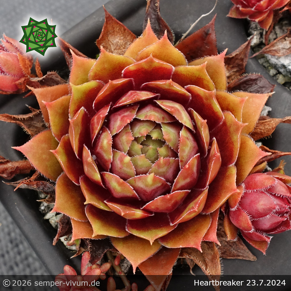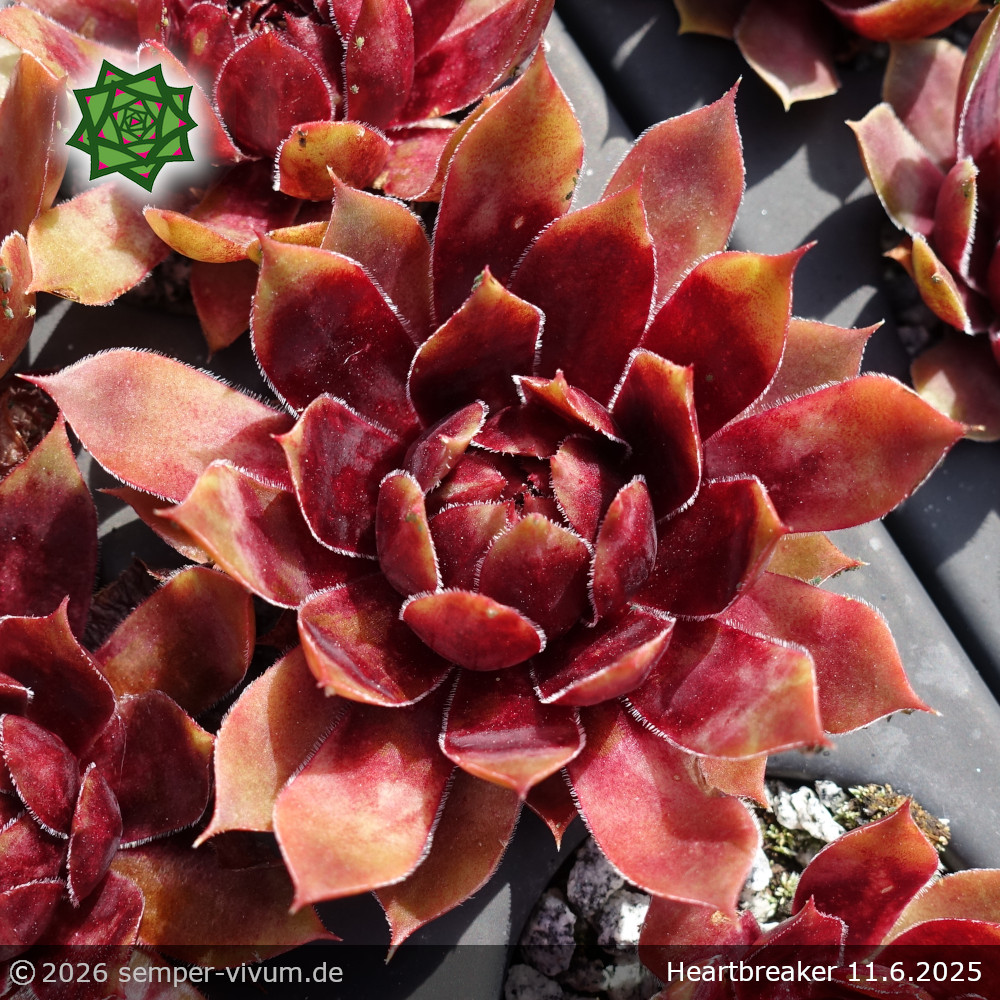 Dieser Hauswurz ist eine sensationelle Neuheit, die fast ganzjährig in brillanten Rottönen leuchtet. Seine Brillanz wurde ihm von seiner Mutter 'Aalrika' vererbt, die kaum Nachwuchs hat. Zur großen Freude vermehrt sich 'Heartbreaker' mit vielen Tochterrosetten. Durch seine Wüchsigkeit ist er wertvoller und wird damit weitaus mehr Herzen vieler Sempervivumliebhaber höher schlagen lassen. Exklusiv bei semper-vivum.de!