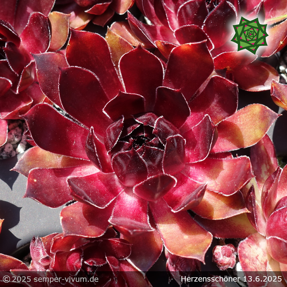 Es ist ein Sämling der sehr gesuchten belgischen Rarität 'Aalrika', die kaum Nachwuchs hat. Die Rosetten haben große Ähnlichkeit in deren Größe, Form und Farbe. Erfreulicherweise ist unsere neue Auslese wüchsiger. Daher könnte man sie schon als eine Verbesserung der Muttersorte beschreiben. Allgemein verlieren viele rote Hauswurz Züchtungen während der heißen Monate ihre brillanten Rottöne. Jedoch fällt 'Herzensschöner' auch zu dieser Jahreszeit durch die leuchtend rote Färbung ins Auge, währenddessen sogar noch orange Töne funkeln.