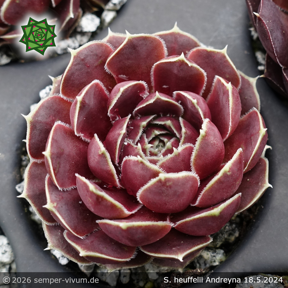 Dieser Donarsbart formt eher kleinere Rosetten, die mit attraktiver purpurner Farbe bemalt sind. Durch helle Blattränder entsteht ein sehr auffallender Kontrast.