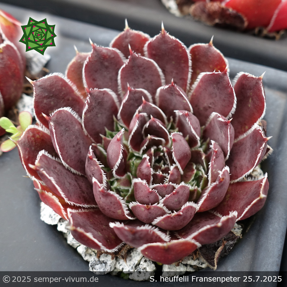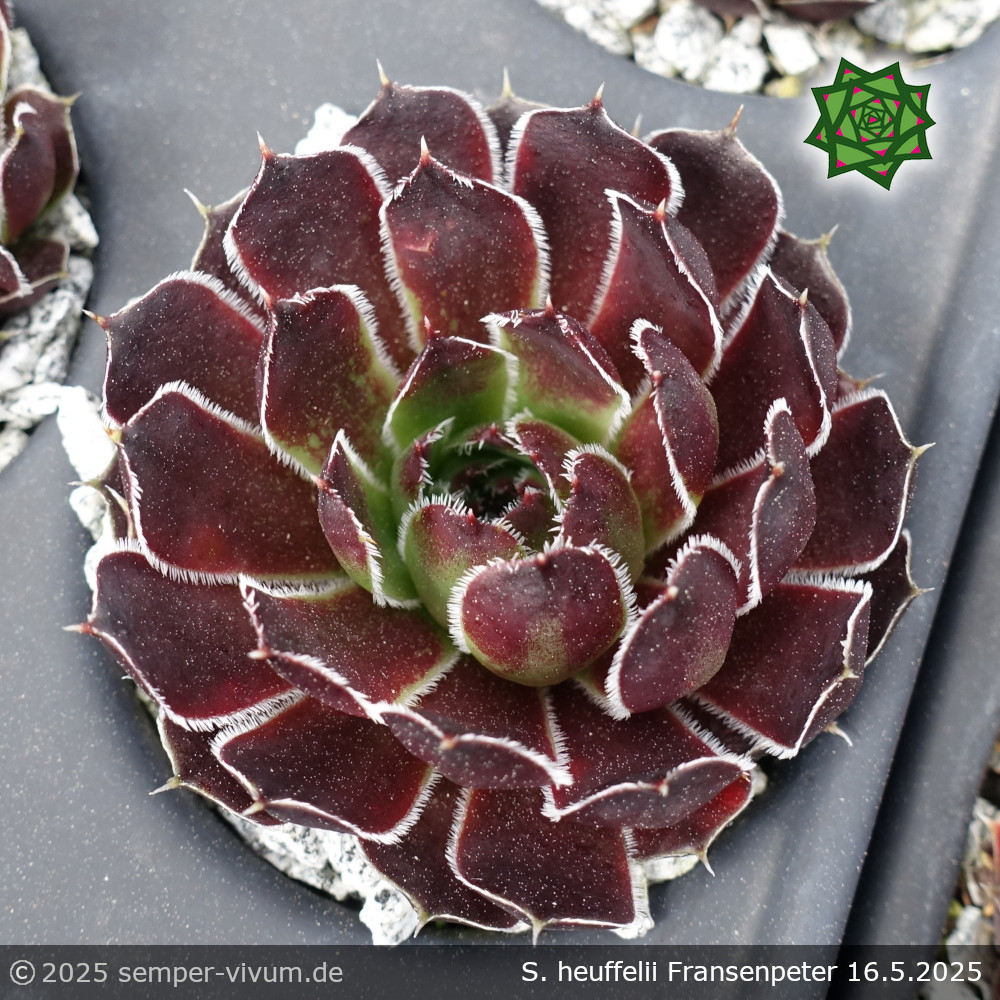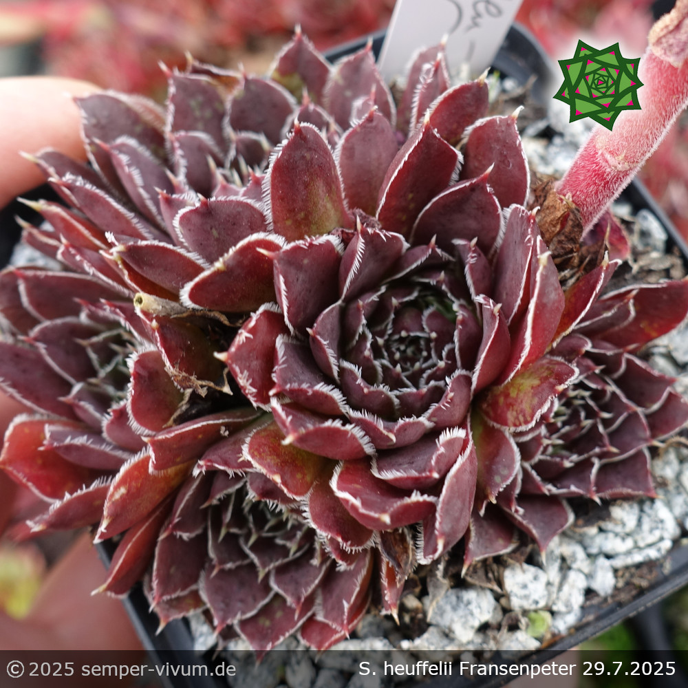 Der 'Fransenpeter' formt kleinere bis mittelgroße Rosetten in dunklen Farben. Die Blätter sind mit einem auffallend lang bewimperten Rand gesäumt. Diese Besonderheit hat zu dieser Namensgebung gerührt. Es ist eine Auslese von vielen Sämlingen der Sorte 'Purga', die wir bereits seit 13 Jahren vermehren. Das bezeugt, dass er recht langsam wächst, d. h. wenig Nachwuchs hat. Er formt kleinere bis mittelgroße Rosetten in dunklen Farben. Die Größe, die Form und auch die Färbung erinnern an die bekannte, deutsche Züchtung 'Schwarzer Peter' aus den 90er Jahren, wobei dessen Rand nur leicht bewimpert ist.