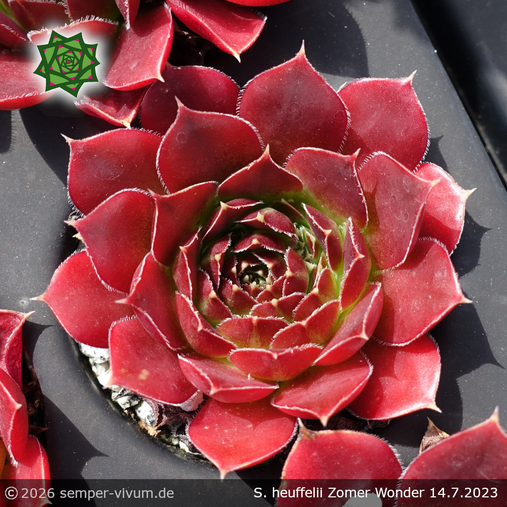 Unter dem Namen dieser bildhübschen Sorte sind zwei verschiedene Klone mit demselben Namen bekannt. Wir haben den angebotenen Donarsbart vom Züchter erhalten. Er formt mittelgroße Rosetten in Karminrot.