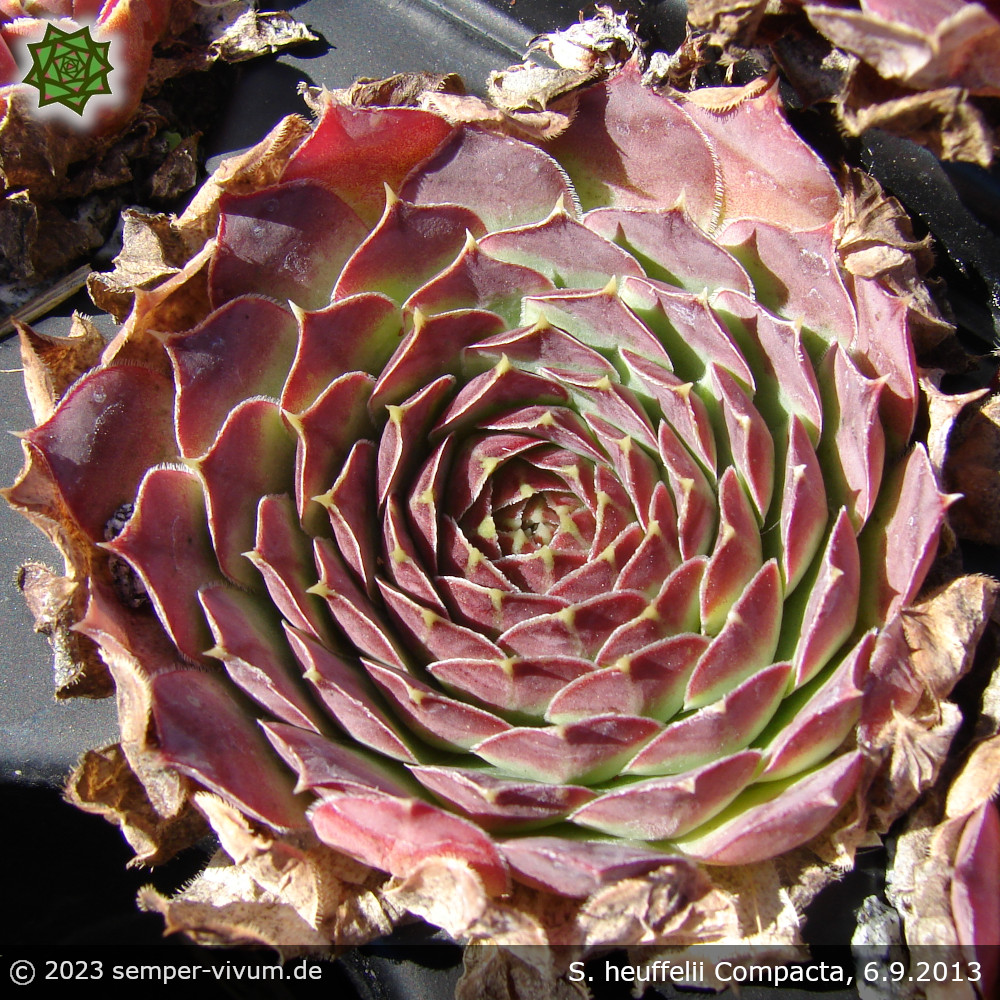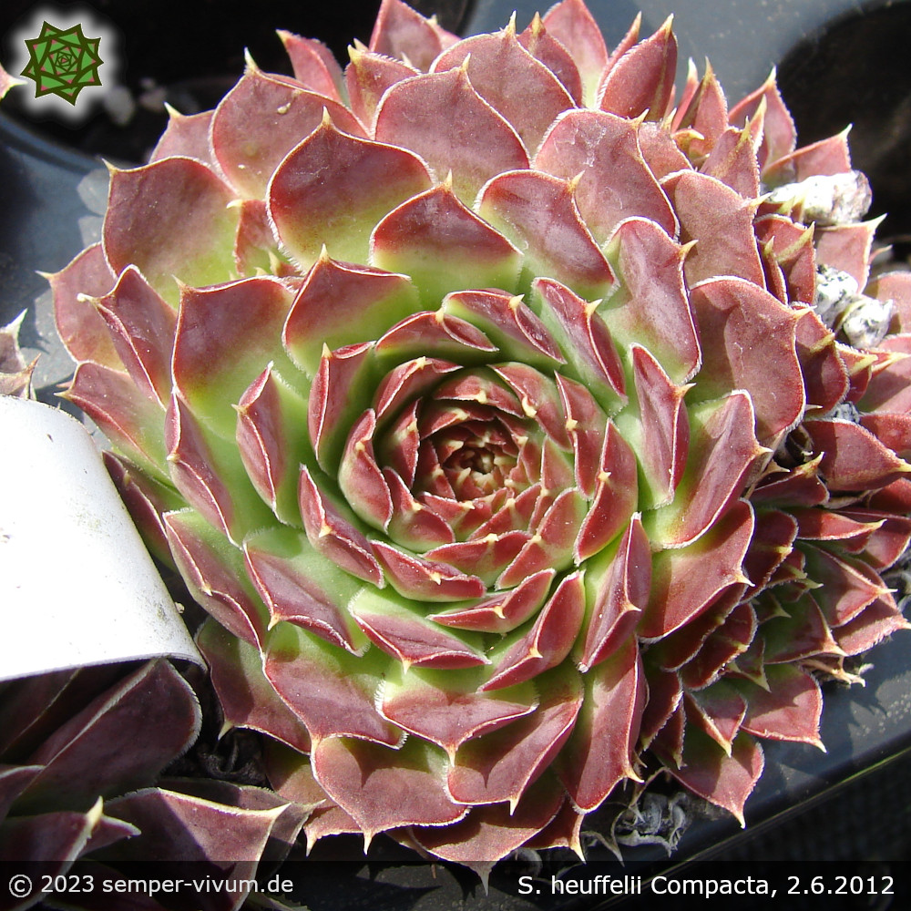 Die Rosetten dieses belgischen Klons sind relativ klein und formen wirklich sehr kompakte Tuffs. Das Ende der Blätter ist auffallend lang gespitzt.
