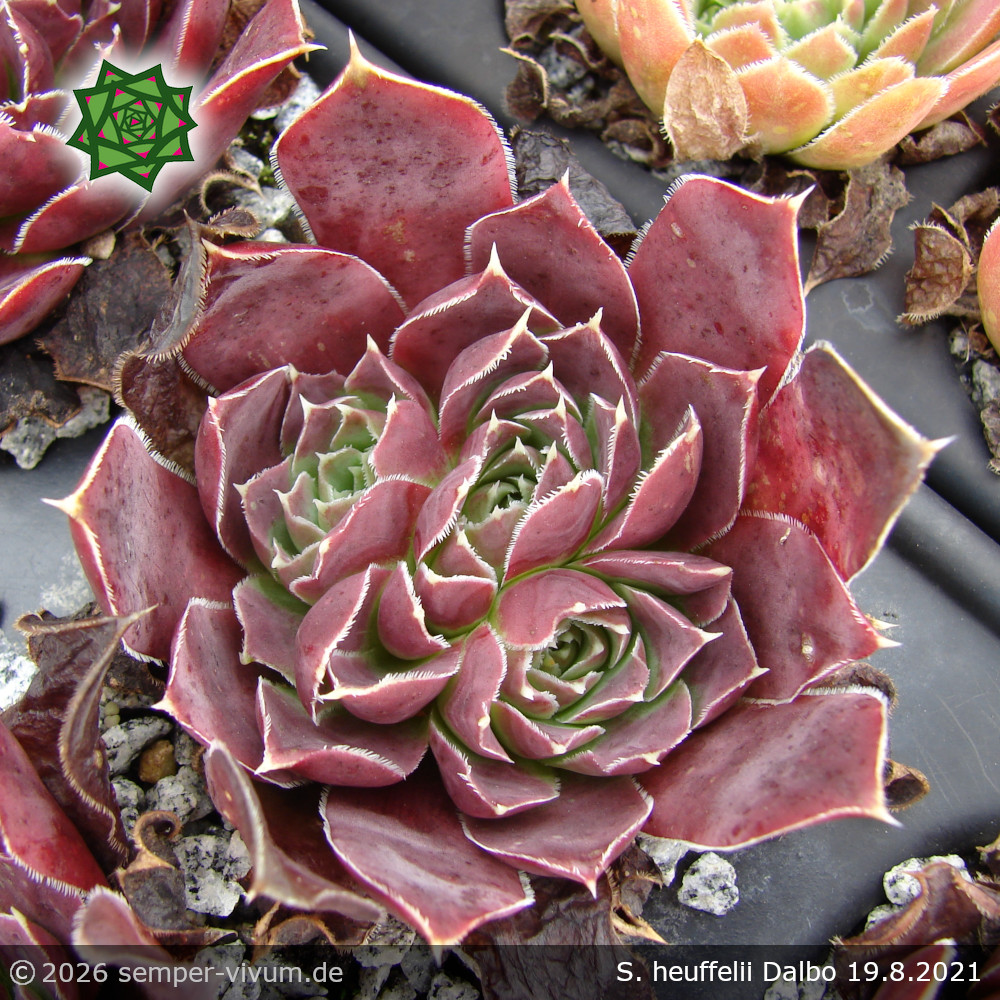 Ein neuer Favorit unter den Donnerwurzen: Die Blätter sind stets irgendwie verdreht. Die Frühjahrsfärbung ist himbeerrosa und der Blattrand dicht bewimpert. 'Dalbo' ist eine brillante Neuheit aus Deutschland vom letzten Jahrzehnt, benannt nach einem Ort in Minnesota (USA).