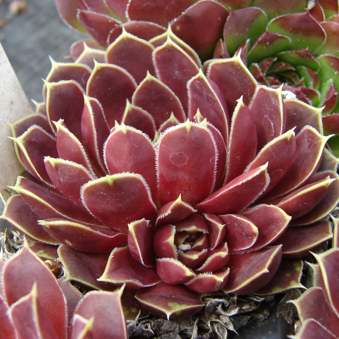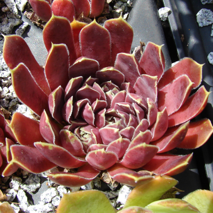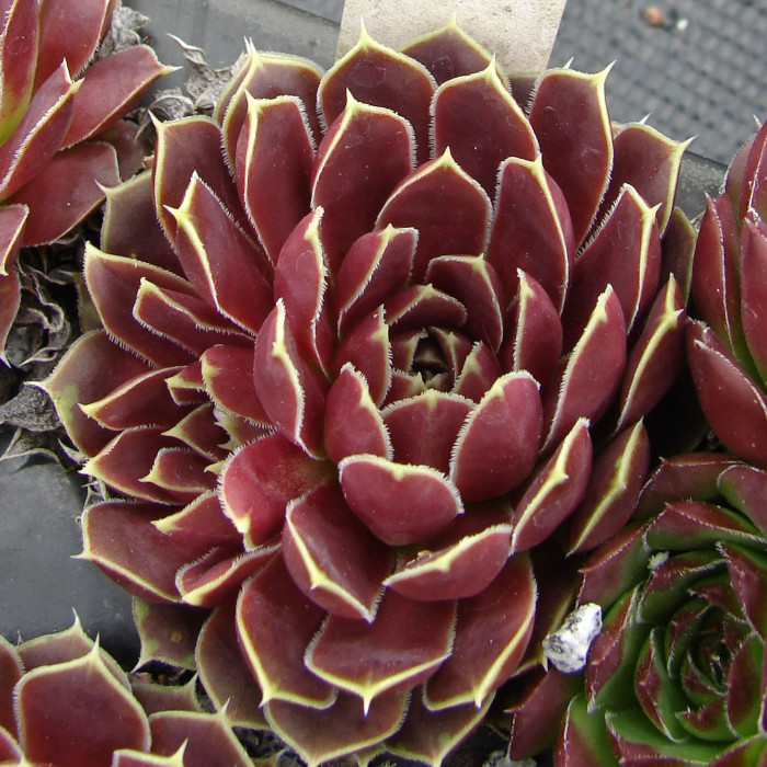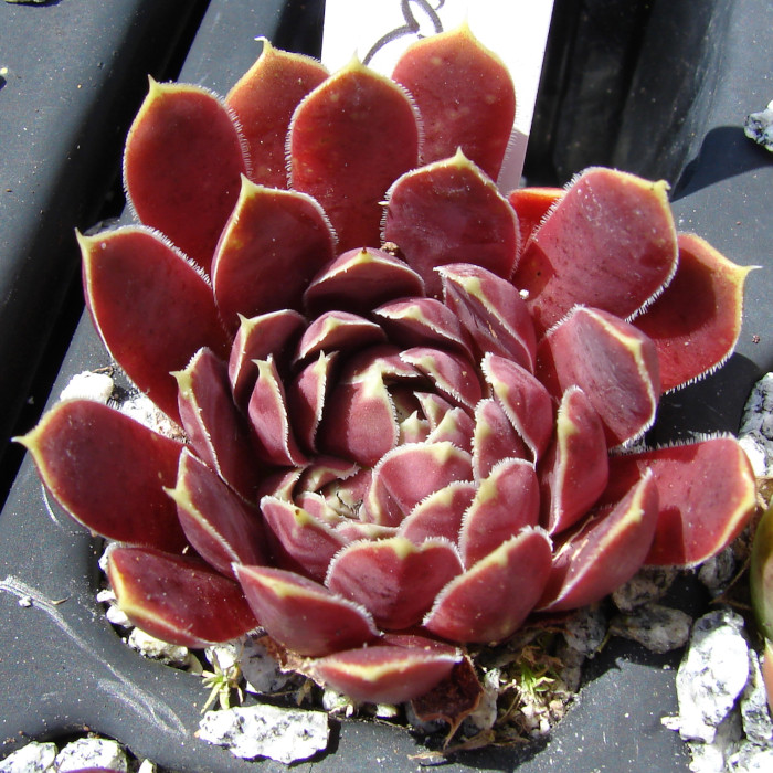Ein dunkles Purpurrot mit kontrastreichem grünen Rosettenrand, der weiß bewimpert ist, zeichnet diesen belgischen Sämling von Gaston Wuyts aus. Leider ist 'Diadora' etwas blühwillig, so ist er eher eine Liebhaberpflanze für den Sammler.