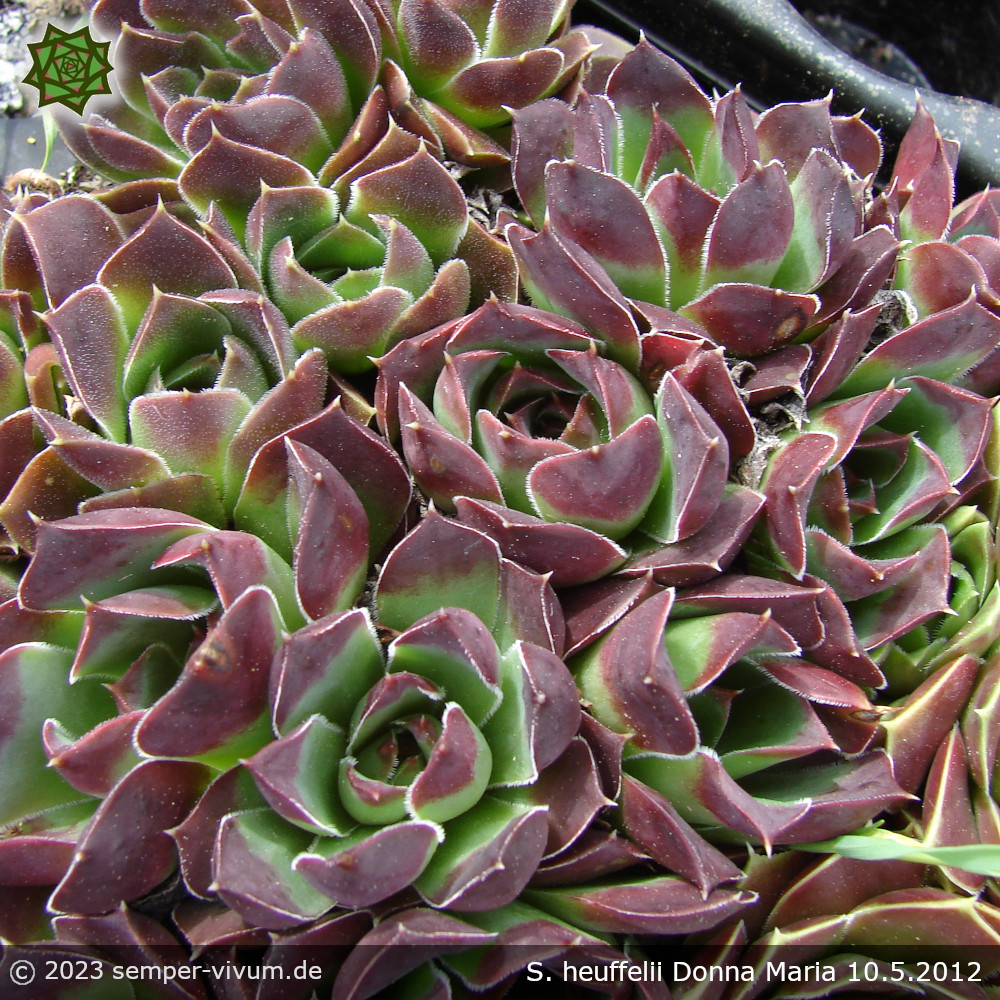 Die dunkelgrünen Blätter sind fast ganzjährig bis zur Mitte in Violett- bis Rotbraun getaucht. Harmonisch ist auch die runde Form der Rosetten. Eine unserer liebsten S. heuffelii Züchtungen aus dem Heer der vielen Namenssorten.