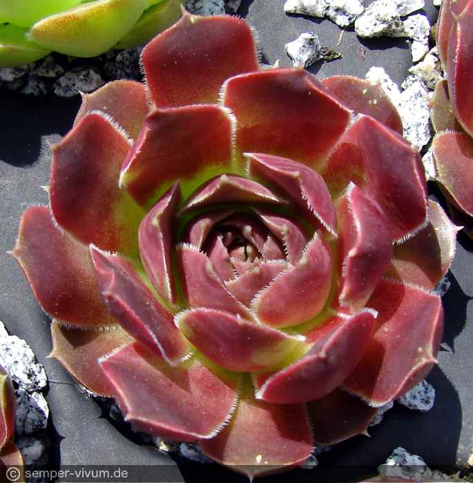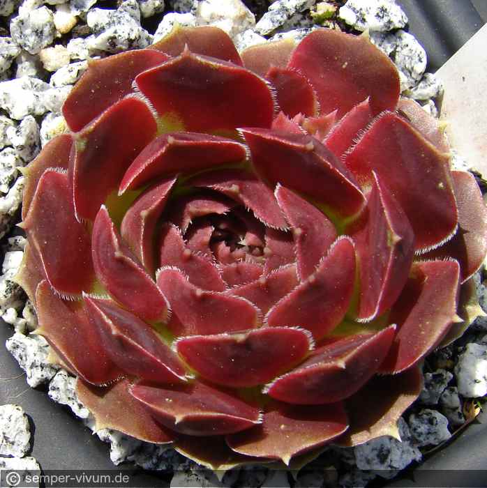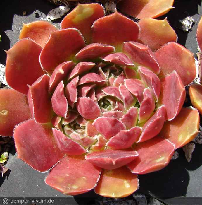 Eine liebenswerte Sorte des Donarbarts mit kleineren Rosetten, die mit purpurfarbenem Violett übermalt sind. Im Sommer in nährstoffarmen Substrat auch mit Beige und Lachsrosa vermischt.