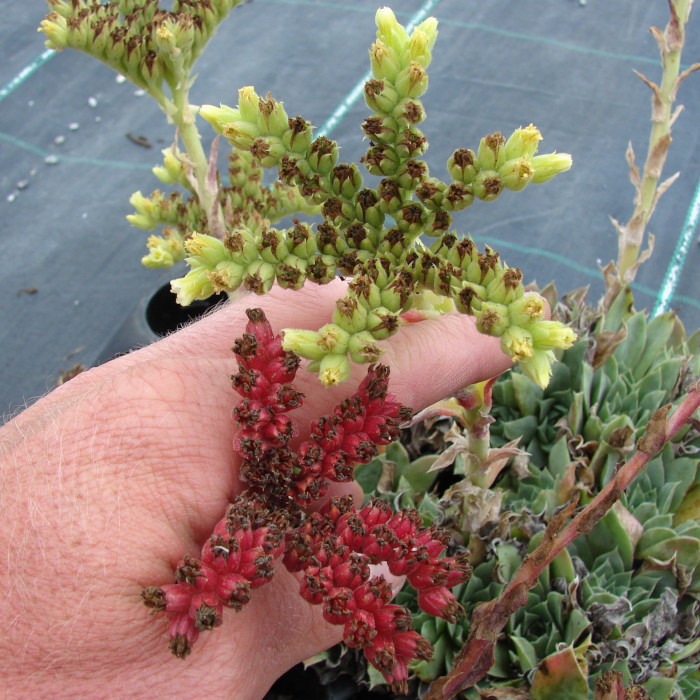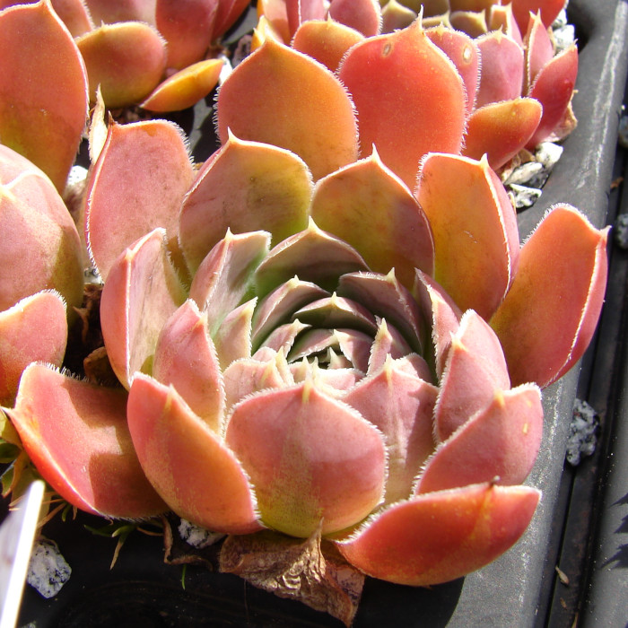 Eine attraktive Auslese aus Belgien, die schon Mitte der 80er Jahren ihren Namen erhielt. Die Blätter sind sehr sukkulent, was den Rosetten ihre einzigartige Form verleiht. Die apfelgrüne Grundfärbung wird während des Jahres mit den unterschiedlichsten Rosatönen bedeckt. Sie gehört zu unseren Lieblingssorten unter den zahlreichen Hybriden des Donarsbart.