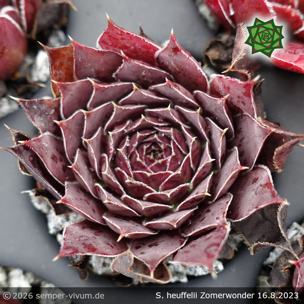 Eine der mystischten Sorten von Andre Smits aus Belgien. Es sind sternförmige, mittelgroße Rosetten in auffallend dunkelvioletten Farben. Abends sind auch bläuliche Töne zu sehen - zauberhaft!