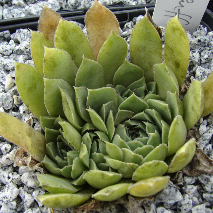 Eine wüchsige Lokalform aus dem Nationalpark Durmitor in Montenegro. Gefunden wurde er in der Schlucht der Tara auf dem Berggipfel Naklo in 1650 m ü.NN. Die mittelgroßen Rosetten bestehen aus schmäleren Blättern und formen dichte Polster in einer Färbung von Lind- bis Jadegrün. Ein attraktiver Naturfund!