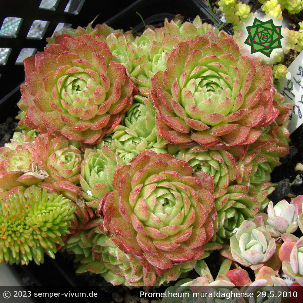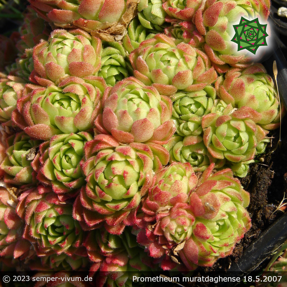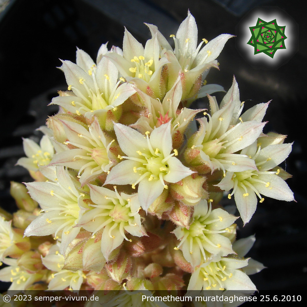 Unter den Dickröschen herrscht ein großes Namenschaos! Diese Pflanze ist auch oft mit einem Namensschild von Rosularia platyphylla zu finden. Die einzelnen Rosetten formen dichte Tuffs - sattgrün mit rötlichem Hauch, der sich in der kalten Jahreszeit intensiviert. Im Sommer öffnen sich die cremeweißen Blütensterne an bräunlich- bis bronzefarbenen Stängeln.