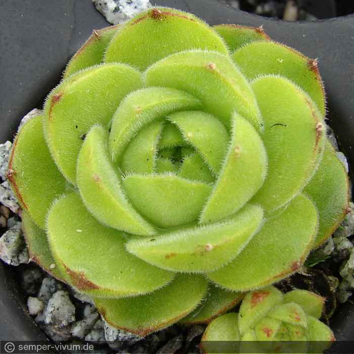 Ein Findling aus Sewan - Nord Armenien. Er wurde dort laut dem Sammler in der Nähe der Brücke zur Insel Sewan gefunden. Wenige, extrem dickfleischige Blätter formen bullige Rosetten mit samtiger Oberfläche. 'Smilie' bildet wenig Nachwuchs, dafür hat er sich bislang als absolut blühfaul erwiesen, weshalb wir diese außergewöhnliche Lokalform bis heute keiner Art zuordnen konnten. Vermuten lässt der Fundort auf die Zugehörigkeit oder Verwandtschaft zu S. transcaucasicum. Bitte schützen Sie diese Hauswurz unbedingt vor übermäßiger Nässe. Eine Rarität, die wir eher dem Liebhaber empfehlen!