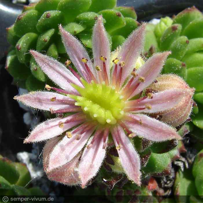 Unser kleiner Frosch bildet kompakte Polster mit ca. drei Zentimeter großen Rosetten. Besonders auffallend sind die glänzenden Blätter an sonnigen Tagen. Die Sämlingsauslese von 'Black Mini' ist wüchsig und hat große Ähnlichkeit einer Kreuzung von S. grandiflorum mit S. montanum, die im Jahre 1889 als S. x christii beschrieben wurde.