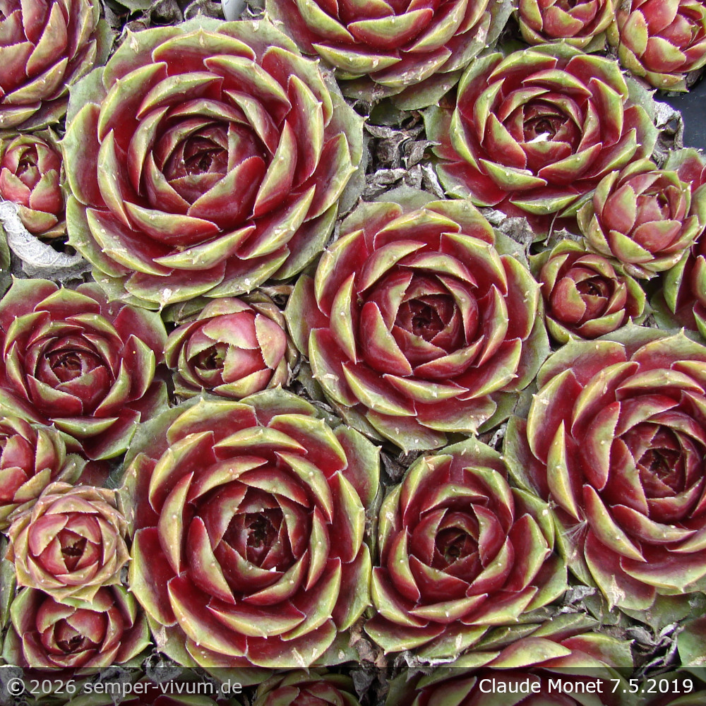 Die seerosenförmigen Rosetten sind auffallend breitblättrig, sukkulent und formen zahlreichen Nachwuchs. Die Blattoberfläche glänzt im Frühjahr und wirkt dann wie mit Lack überzogen. Zu dieser Zeit erinnert der Anblick an wachsartige Substanz. Bemerkenswert ist ihre Unempfindlichkeit gegenüber Hitze, die heutzutage auch so mancher Sempervivum-Züchtung Probleme bereitet. Das Aussehen erinnert an eine Mischung aus seinem Geschwistersämling 'Dampfnudelblues' und unserer beliebten Sempervivum des Jahres 'Picasso'. Ein wüchsiger Sämling von 'Tarita'.