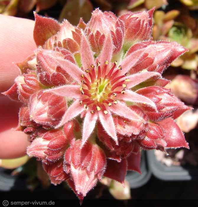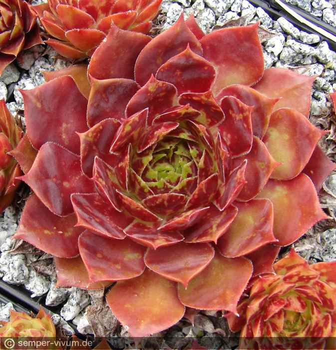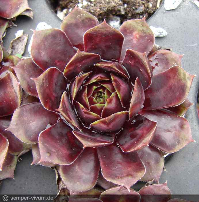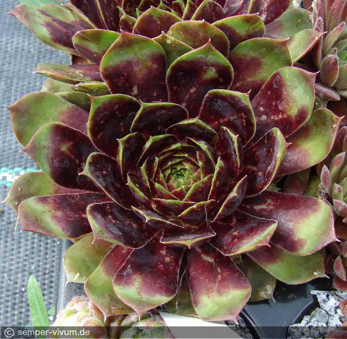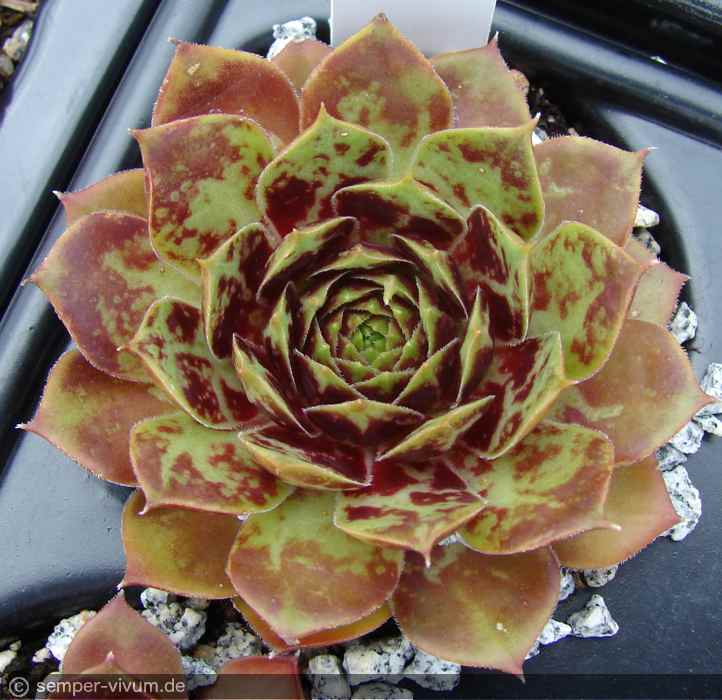 Diesen Geschwistersämlig von 'Picasso' vermehren wir nun schon seit über zehn Jahren: Er formt größere Rosetten mit einem Durchmesser von etwa 10 bis 12 cm und zeigt ganzjährig viele Gesichter. Die nahezu schwarze Frühjahrsfärbung wurde unserer Auslese von der Mutter 'Innocentia' weiter vererbt. Besonders auffallend ist bereits ab Mitte April die glänzende Blattoberfläche, die wie lackiert wirkt. Ende Mai erscheinen zahlreiche Flecken auf dem Laub, wodurch bis Juli einen sensationeller Anblick entsteht, Donnerwetter!