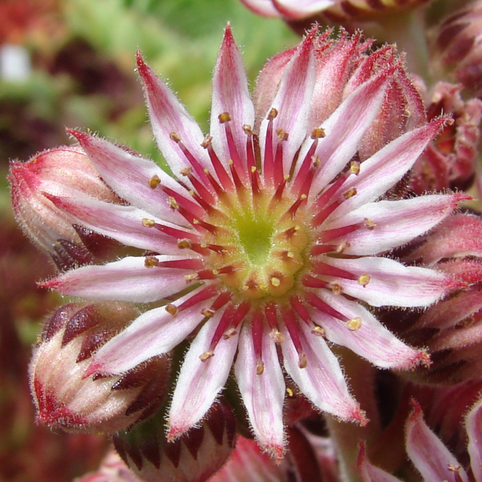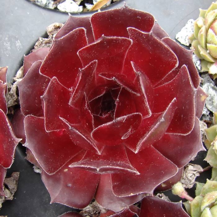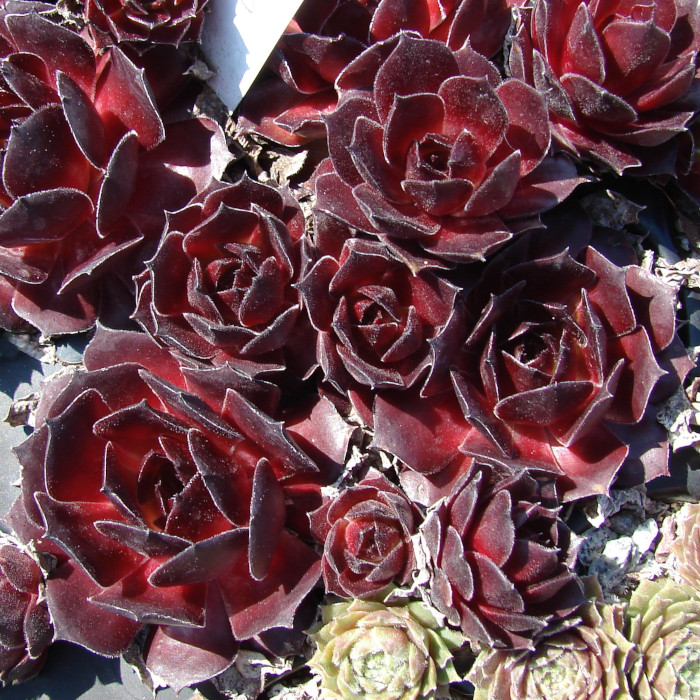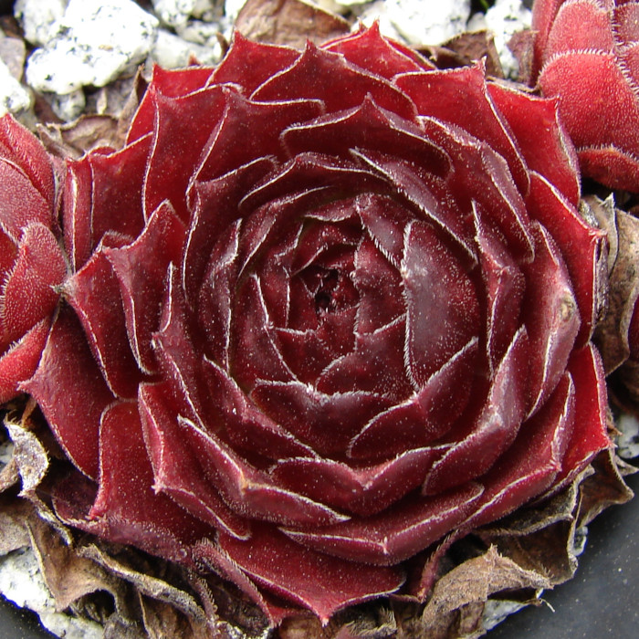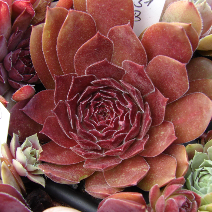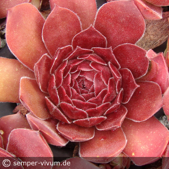 Es gibt in der Tat schon Züchtungen, die bis zum Sommeranfang dieser Auslese auffallende Ähnlichkeiten aufweisen. Doch ab Mitte Juni wirken die Blätter der ca. 8 cm großen Rosetten leicht gewellt, ja irgendwie verdreht, was insgesamt zu einer brillanten Form führt. Durch die samtene Textur der Blätter wirkt sie noch edler im Herbst. Dazu diese burgunderrote Farbe, herrlich! Sie stammt aus Sämlingen von S. transcaucasicum ex SEWAN Island PH931 und hat somit Verwandte aus armenischer Abstammung.