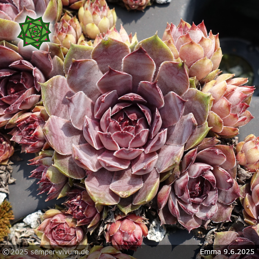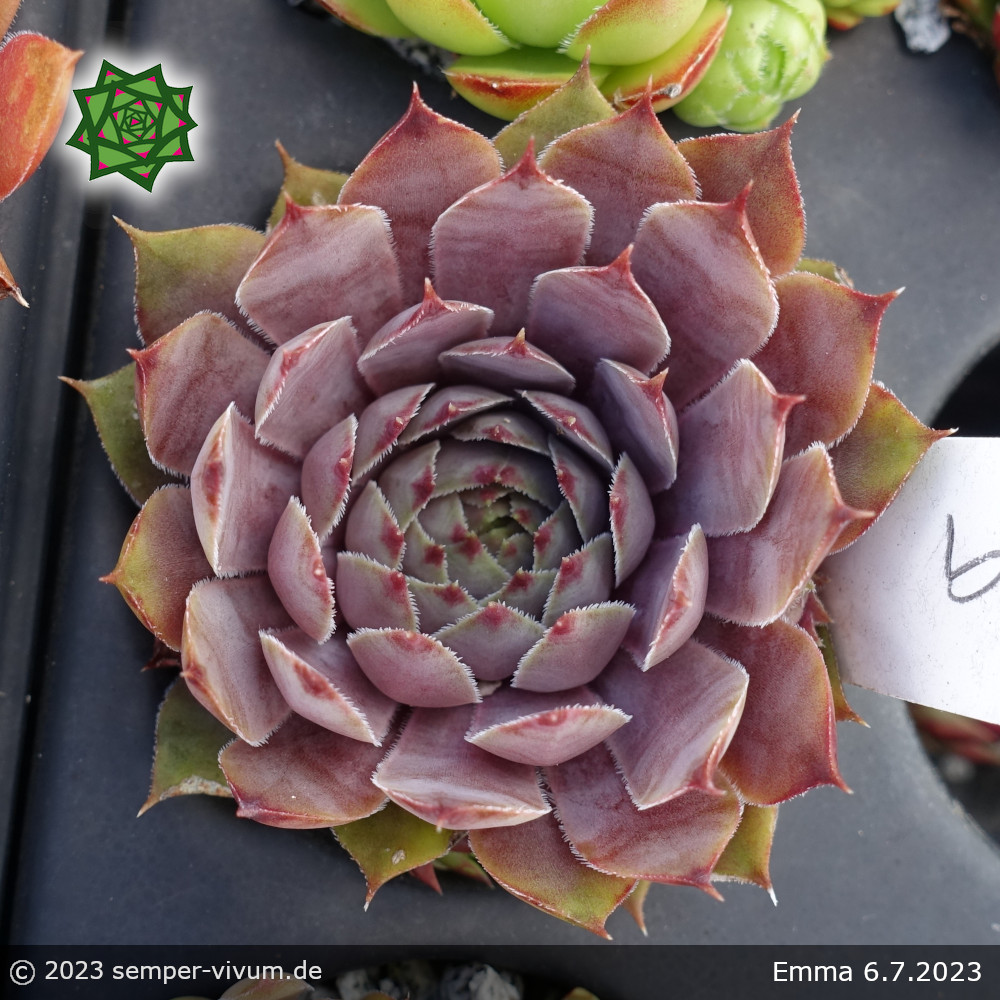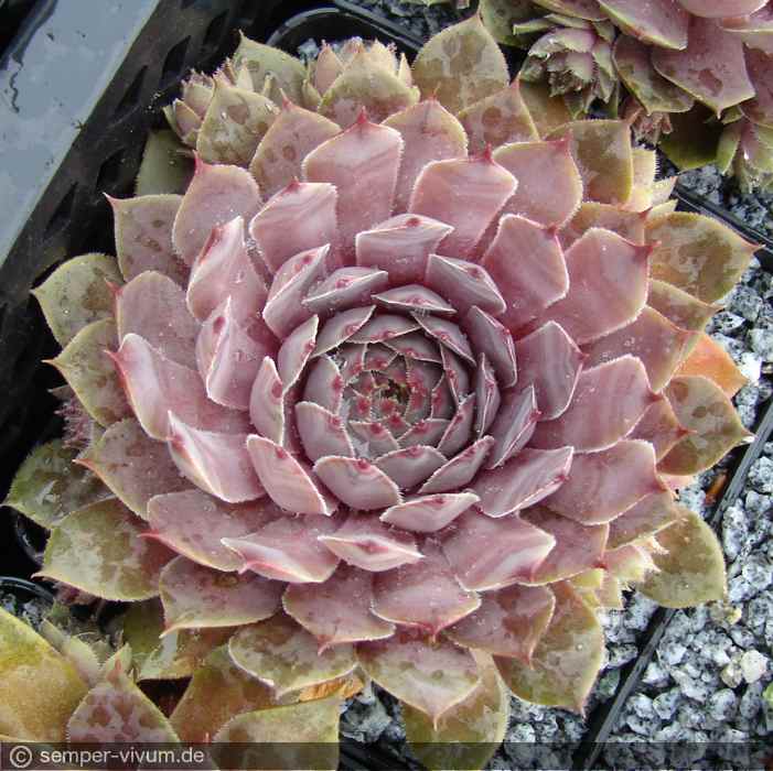 Dieser Sämling unbekannter Eltern spielt im Frühjahr mit den unterschiedlichsten violetten Farben. Die jadegrünen Blattränder sind leicht bewimpert und verfärben sich mit den äußeren Blättern bis zur kühlen Jahreszeit in olivgrüne bis ockerfarbene Töne. Die Rosetten messen einen Durchmesser von 9 bis 12 cm. Die Blüten sind ungewöhnlich gefärbt und leicht behaart.