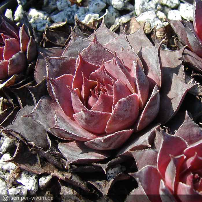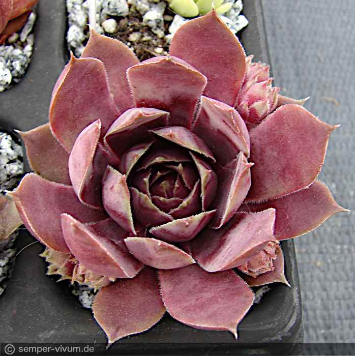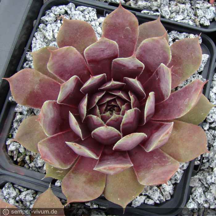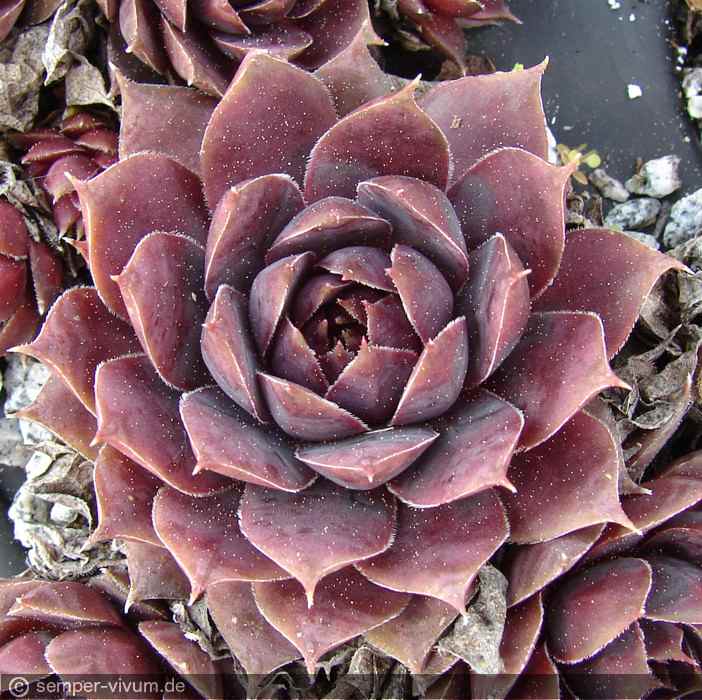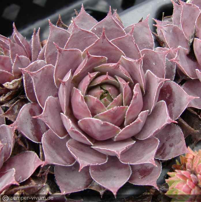 Eigentlich wäre der Name einer bekannten Schokolade recht passend, doch damit wäre Nestle wahrscheinlich nicht einverstanden gewesen. Der Sämling von 'Epinella' hat Ähnlichkeiten mit der Mutter, doch die Rosetten sind wesentlich größer und von der Färbung gibt es Unterschiede. Im Mai ist das Zentrum in dunkles Violett getaucht, wodurch einen guter Kontrast zur restlichen Blattfärbung entsteht. Im Herbst wirken die Blätter bläulich überzogen.