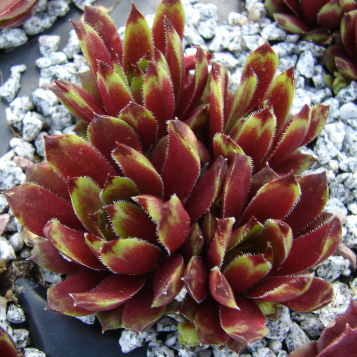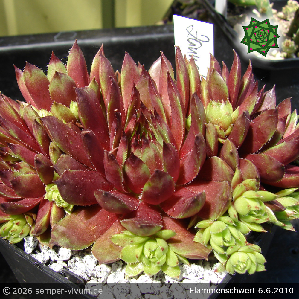 Die Blätter sind sehr spitz und auffallend geflammt. Besonders intensiv zeigt sich das Farbenspiel während des Frühjahrs bis zum Sommeranfang. Aufregend wenn die zahlreichen kleinen Töchter sprießen, denn die kleinen Rosettchen sind in helles Grün getaucht. Ein toller Kontrast! Die Rosetten erreichen einen Durchmesser von etwa 6 Zentimetern und wachsen sehr kompakt. Die Mutter dieses Sämlings ist 'Zannalee' von der 'Flammenschwert' sein zackiges Aussehen geerbt hat.