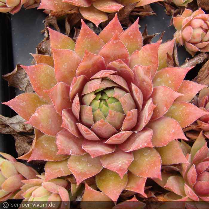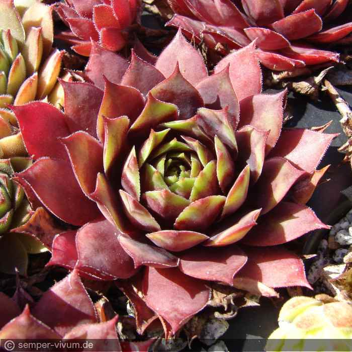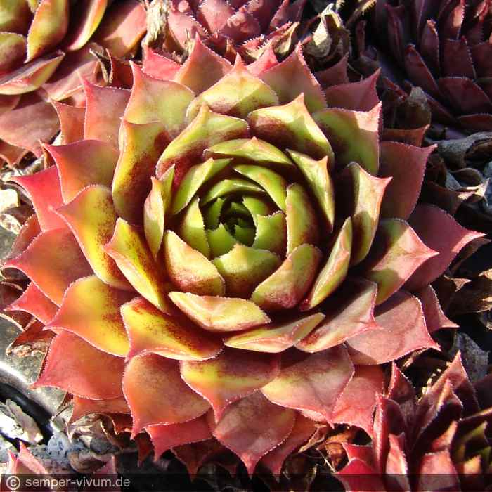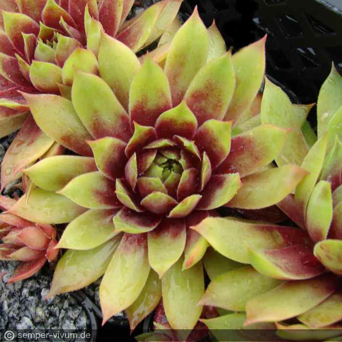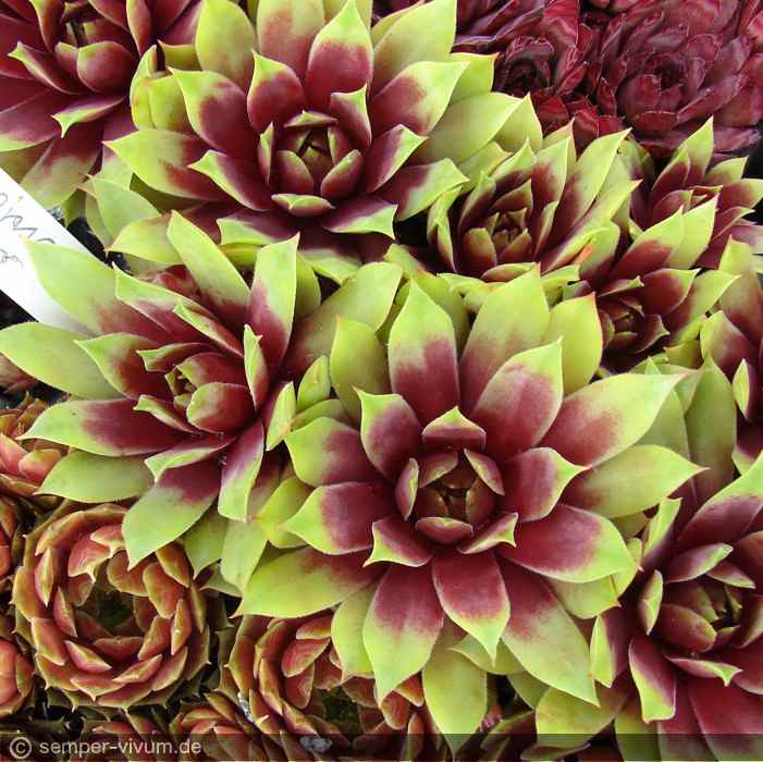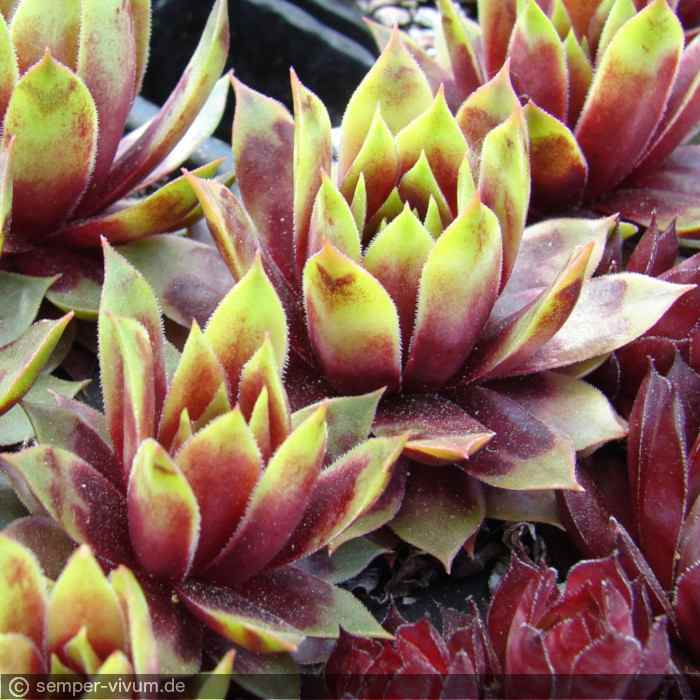 Ein neuer Stern mit grandioser Färbung. Im April relativ knospige Rosetten mit dunklem, kirschrotem Zentrum. Die Blattspitzen sind währenddessen nahezu gelb getönt und präsentieren sich im Mai zur Hälfte honigfarben, bis Juni grüngelb. Zum Herbst hin spielt 'Lemon Kiss' mit Jadegrün und rosa Pastell. Es ist der Geschwistersämling zu 'Dornröschen' und 'Drachenblut'.