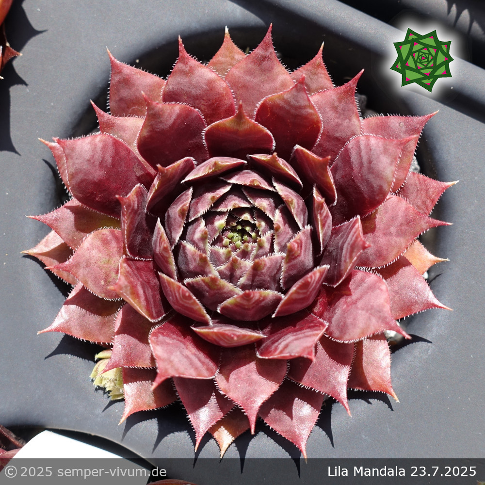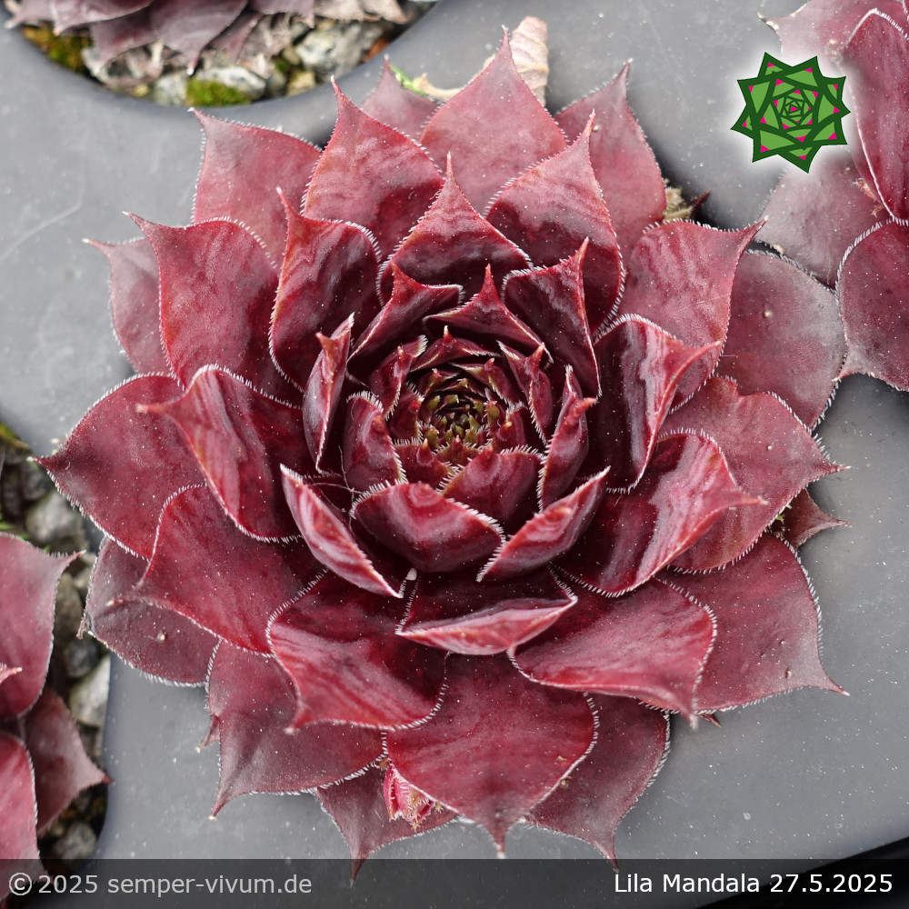 Sempervivum 'Lila Mandala' formt bis zu 10 cm große Rosetten. Das Laub endet in einer langen Spitze. Der Rand ist auffallend stark bewimpert. In der kalten Jahreszeit führt das zu einem silbrigen Glanz, da die Blätter von Spätherbst bis Anfang Mai mit dunkelster schwarz-violetter Farbe überzogen sind. Wenn die Tage wieder länger werden und die Temperaturen steigen, so ändert sich die Farbe der äußeren Blätter und Ende Juni sind sie dann schon arg von der Sonne ausgeblichen. Das führt zu einer richtig bunten Erscheinung. Dieser Hauswurz formt kompakte Polster. Es ist kaum zu glauben, dass die Mutter dieser Auslese 'Bloody Mary' ist, denn mit dieser Sorte hat sie nichts gemeinsam: Weder eine bullige Form noch die leuchtend rote Farbe und auch keine samtigen Blätter. Wer hier wohl der Vater ist?