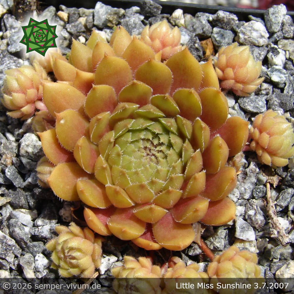 Dies ist eine der sonnigsten Sämlinge aus unseren Aussaatschalen. Die etwa vier Zentimeter großen Rosetten sind im März fast vollständig rosa überzogen. Später leuchten sie in orangefarbenen Tönen. Der Rosaton bleibt zu dieser Zeit an der Basis der Innen- und Außenseite erhalten. Das Herbstkleid des Sämlings von 'Bronze Pastel' zeigt eine helles Olivgrün. 'Little Miss Sunshine' ist ein Geschwistersämling von 'Chocolate Pepper'.