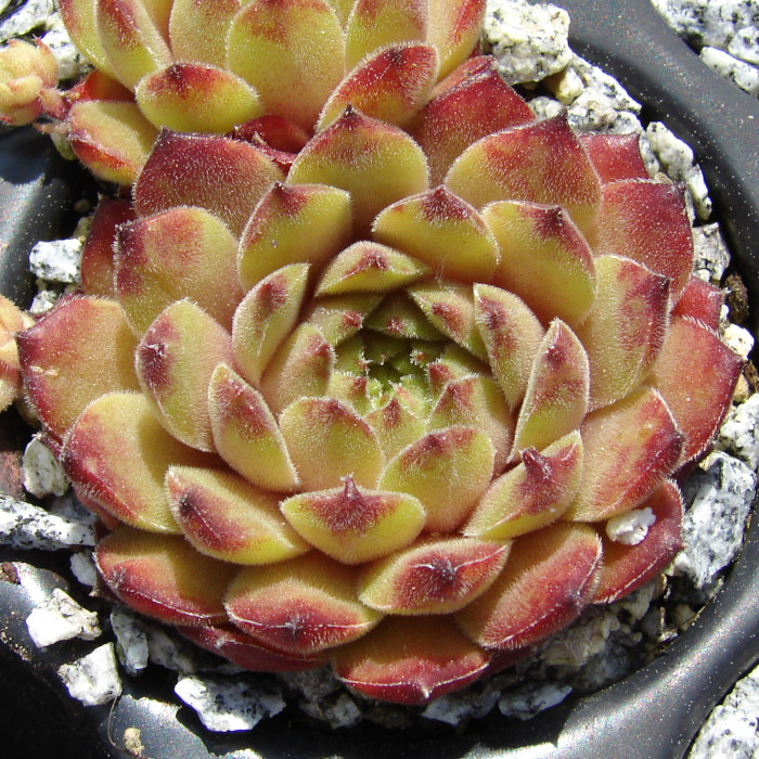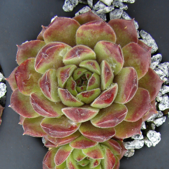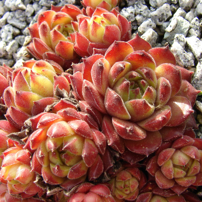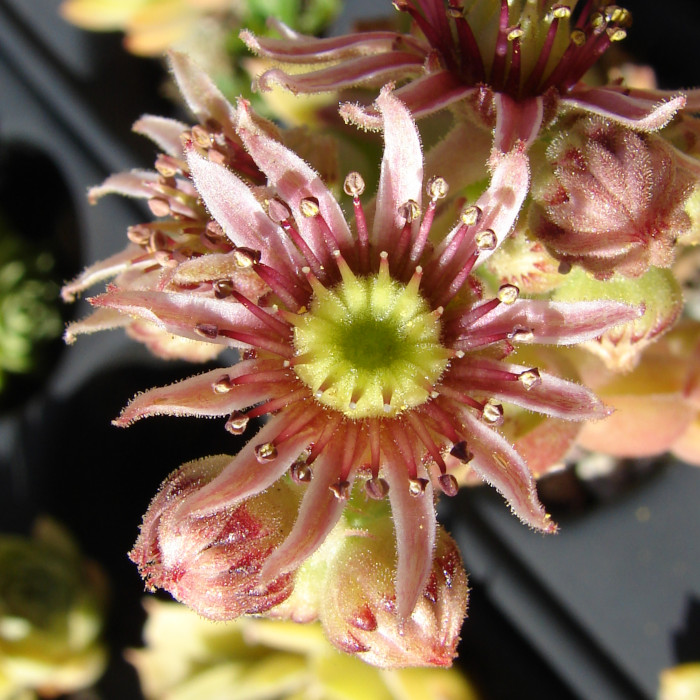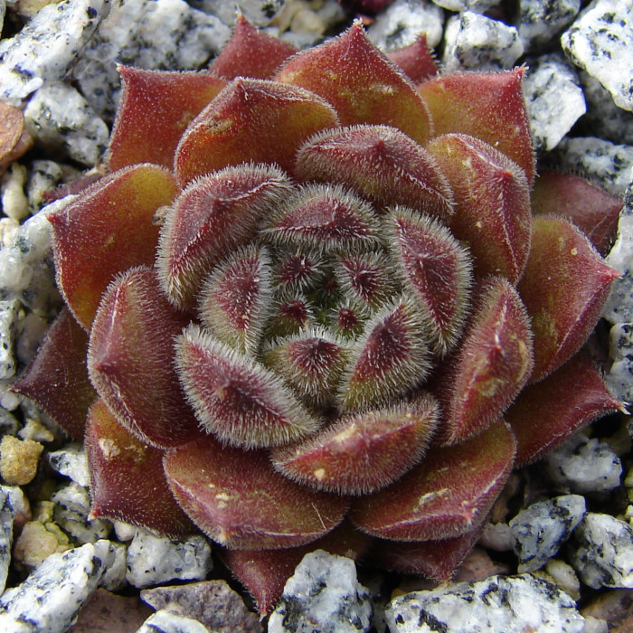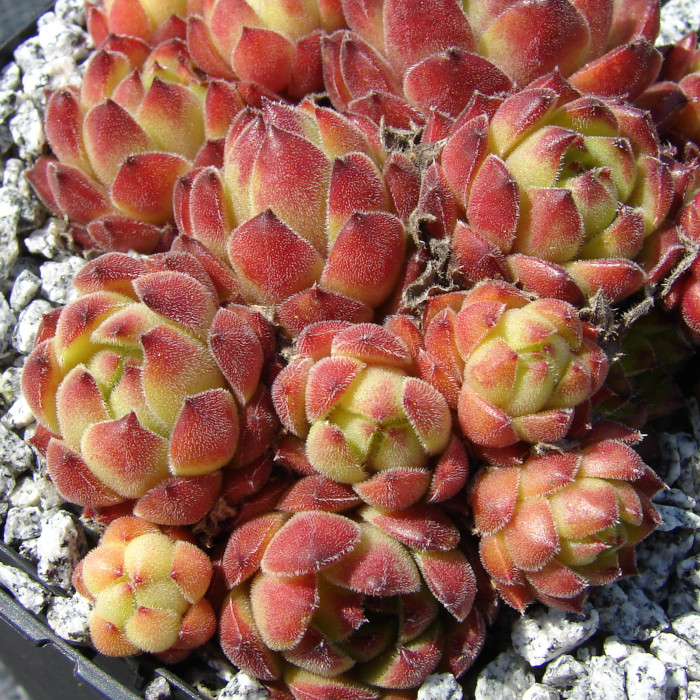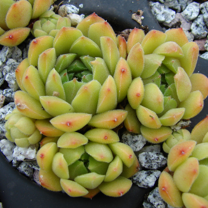 Ein reizender Sämling von 'Eisbär', der sehr kompakte, stark sukkulente Polster formt: Die inneren Blätter der eher kleinen Rosetten sind im zeitigen Frühjahr auffallend behaart. Bis Ende Mai verändert sich diese Textur in leicht samtene Oberfläche. Im Juli öffnen sich die Blüten: Ihre Petalen sind leicht verdreht, wodurch eine ungewöhnliche Form entsteht. Insgesamt erinnert er an einen Mops, daher der Name