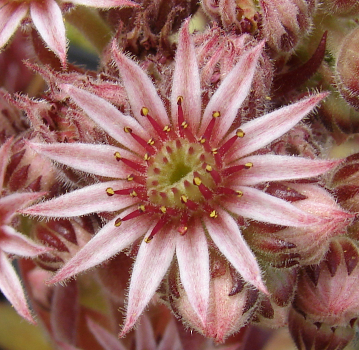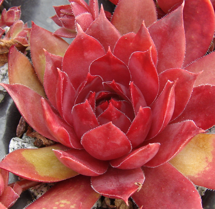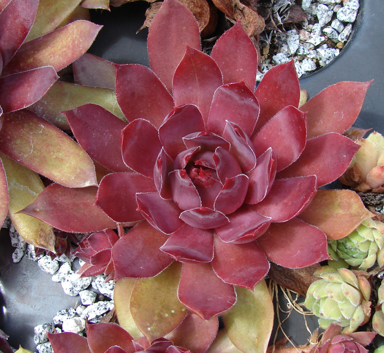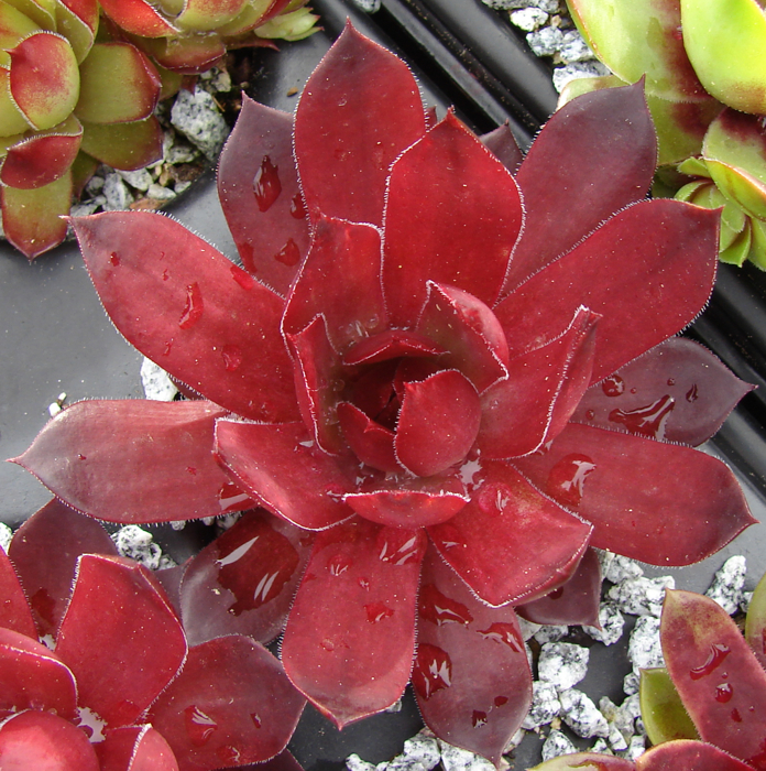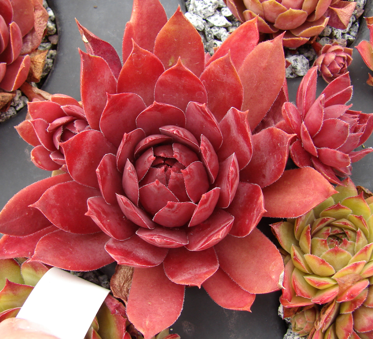 Dieser brillante Stern ist durch seine ungewöhnliche Färbung während der lichtreichen Monate des Jahres eine Attraktion in unserer Sammlung. An einem vollsonnigen Standort schmücken sich die mittelgroßen bis großen Rosetten ganzjährig mit den unterschiedlichsten Magentatönen. Faszinierend ist bereits die leuchtend pinkfarbene Färbung im zeitigen Frühjahr, die bis zum Frühsommer anhält. Später wandelt sich diese eher zu Rosa und es scheint als wäre die einzelne Rosette aus wachsartiger Substanz. Die Blattspitzen behalten die feurige Tönung vom Frühjahr, mit der sie auch noch immer Sommer glühen. Zum Herbst sind die Blätter leicht nach innen gebogen. Dadurch erhält die Rosette eine leicht knospige Form. 'Shocking Pink' ist eine Auslese von Sämlingen der tschechischen Sorte 'Mila'.