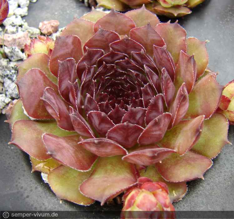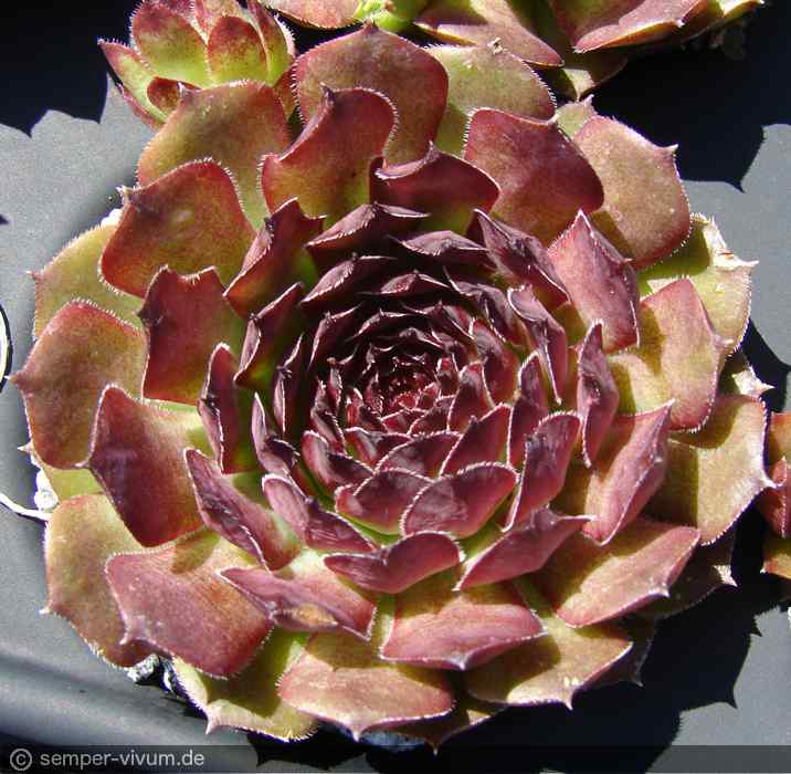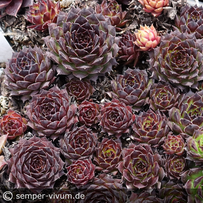 Die Auslese von Sämlingen unserer Sorte 'Tintenblut' formt okkulte Rosetten mittlerer Größe. Während sie bereits im zeitigen Frühjahr in ein edles Mahagonibraun getaucht sind, erscheinen die Blätter ab Mitte Mai olivgrün mit violettem Purpur, marmoriert in leicht gewelltem Muster.
