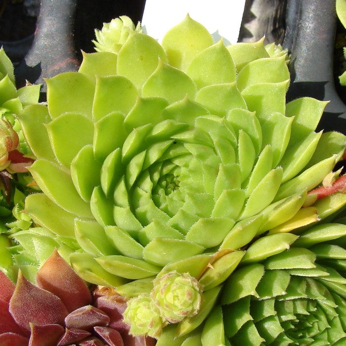 Eine Auslese mit mittelgroßen, spitzen Rosetten in rötlich-orangen bis gelbgrünen Tönen. An einem Ausläufer sitzen manchmal mehrere Tochterrosetten, was sehr ungewöhnlich ist. Die Stolonen sind zu dieser Zeit auffallend kontrastreich gefärbt.