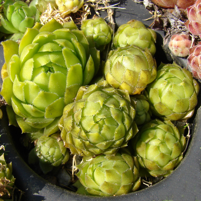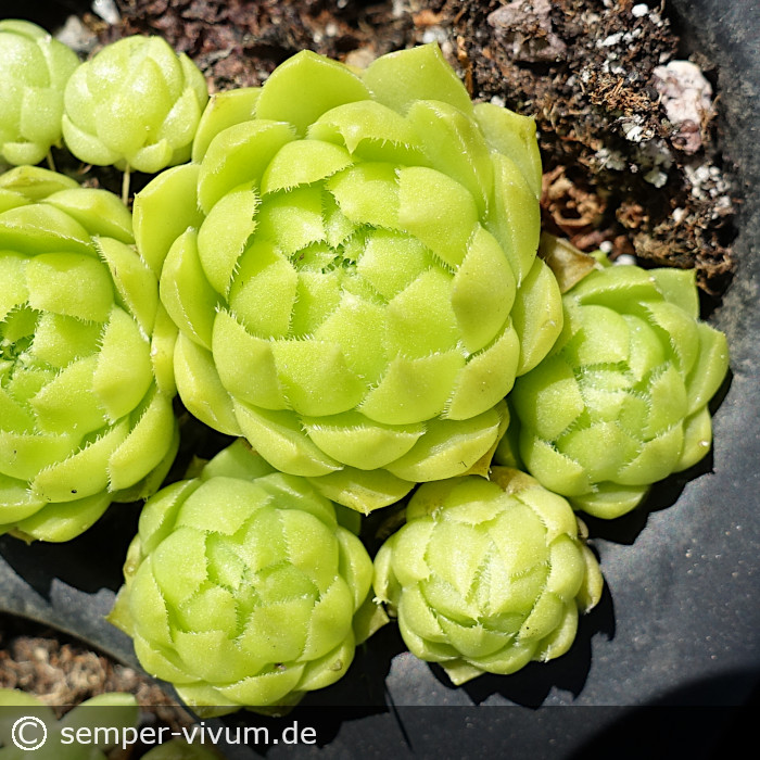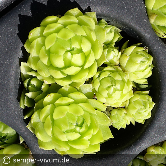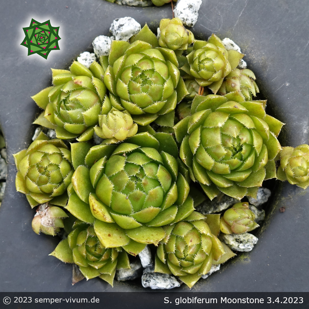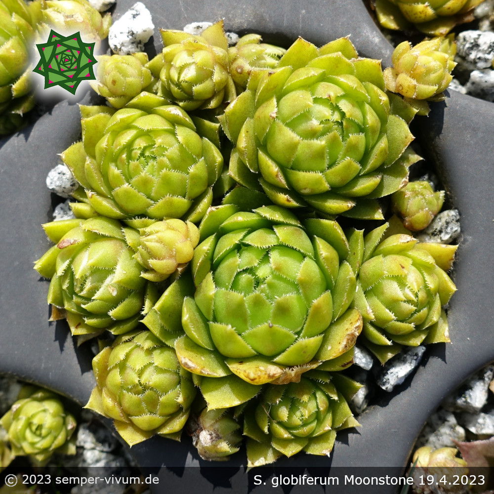 Neben den vielen Auslesen der Hen and Chic's gibt es auch richtig prächtige Sorten, die ihre eigene Form und Färbung zeigen. Die hübsche Auslese 'Moonstone' formt kugelige Rosetten und ist zeitweise fast gelb gefärbt.