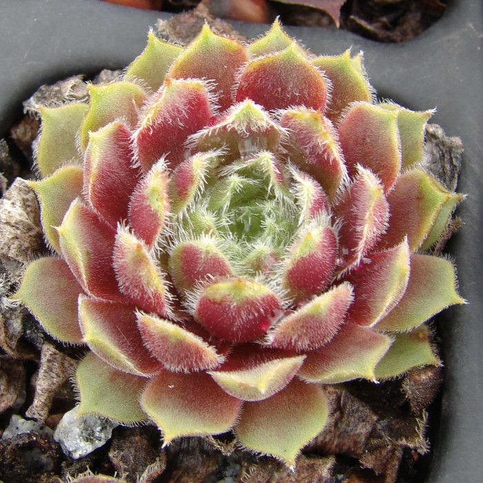 Der wüchsige Schwarzwald Sämling mit seinen 3 cm großen Rosetten bestehen aus leicht samtenen Blättern mit weißen Randwimpern. 'Katalin' ist ein Sämling einer kleinrosettigen grünweißen unbekannten Sempervivum arachnoideum Hybride. Zu Beginn der Wachstumsphase ist der Zuwachs anfänglich erst unscheinbar matt grün. Mit zunehmender Sonnenintensität und Wachstum beginnt die Verfärbung. Das anmutige 3 Farbspiel von intensiven Pastelltönen wirkt mit hellem frischem Grün, dem Rose und den weiß bewimperten Blatträndern sehr ansprechend. Im Gegensatz zum aktuellen Trend von großen Rosetten und kräftig leuchtenden Farben, ist Katalin mit ihrer harmonisch ausgewogenen Verfärbung eher etwas für zarte Romantiker. Nicht ohne Grund zählt der Züchter diese neue Sorte zu seinen Lieblingen. Sie erinnert an die bereits prämierte amerikanische Sorte 'Lavender and Old Lace', bei der der kräftige Lavendelfarbton dominiert, jedoch die weiße Wimpern nur spärlich in Erscheinung treten. Derzeit exklusiv bei semper-vivum.de!