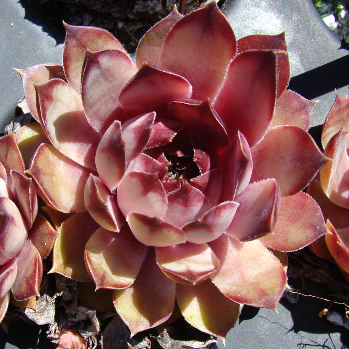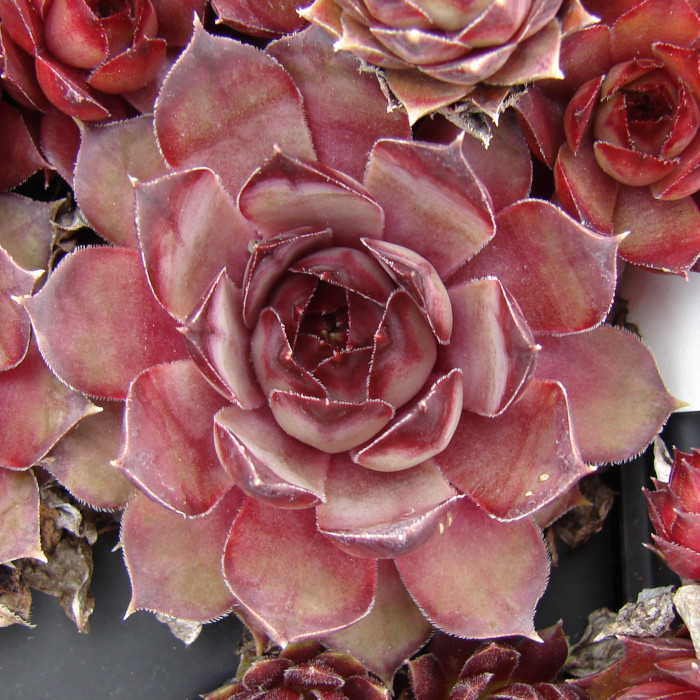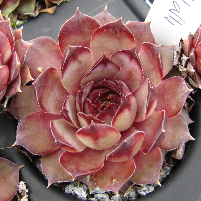 Eine bislang recht unbekannte, belgische Sorte mit größeren Rosetten in attraktiver Färbung. Es ist eine Mischung aus verschiedenen Rosatönen mit bläulichen Nuancen. Die Spitzen sind in kräftiges Purpurviolett getaucht, was zu einem kontrastreichen Farbspiel führt. Ein neuer beachtenswerter Stern in unserer Sammlung!