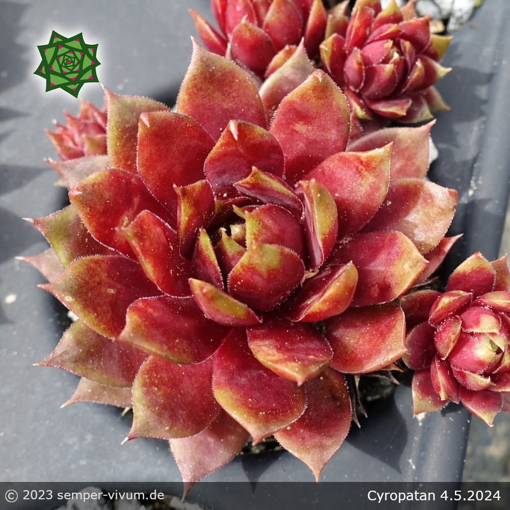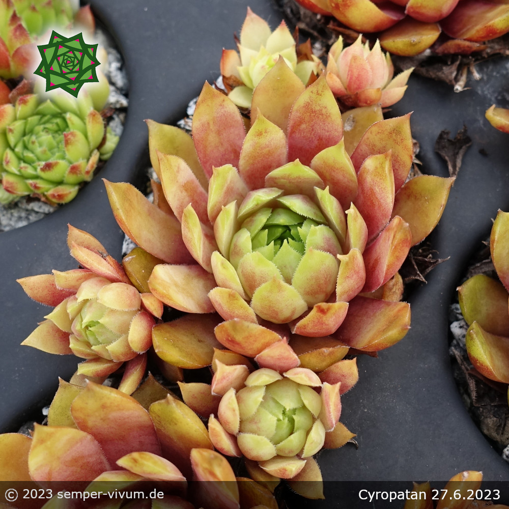 Der Hauswurz formt größere Rosetten in äußerst attraktiver Sommerfärbung. Die Couleur in Karminrot und Orange ist bereits im Frühjahr ein wahrer Blickfang. Wenn die Temperaturen steigen, verändert sich die Szene in eine poetische Stimmung durch verschiedene Pastelltöne. Ab Anfang Juli kommt es dann zum Höhepunkt und besonders an sonnigen Tagen präsentiert 'Cyropatan' ein aufregendes Schauspiel in leuchtend gelber Färbung. Eine Auslese und zugleich absolute Neuheit von Mirko Hartz, die wir seit einigen Jahren in Beobachtung haben. Diese Neuheit ist exklusiv bei uns erhältlich!