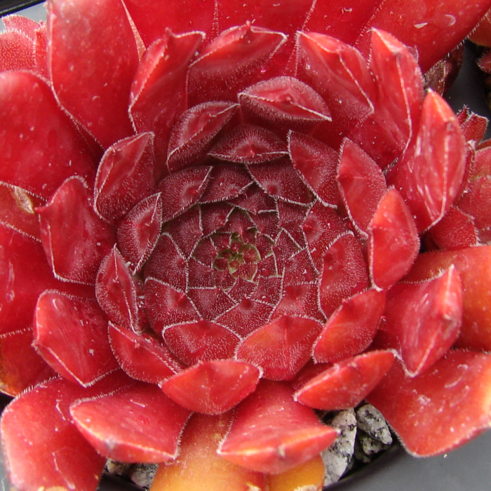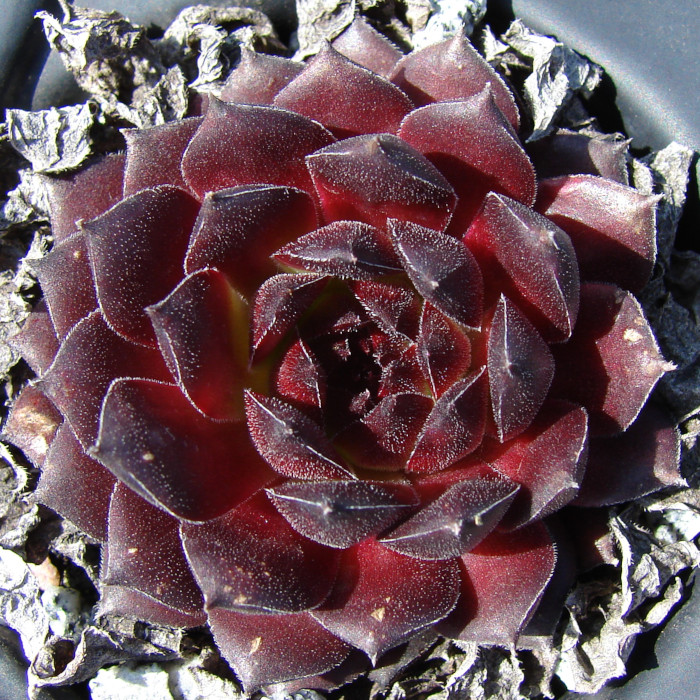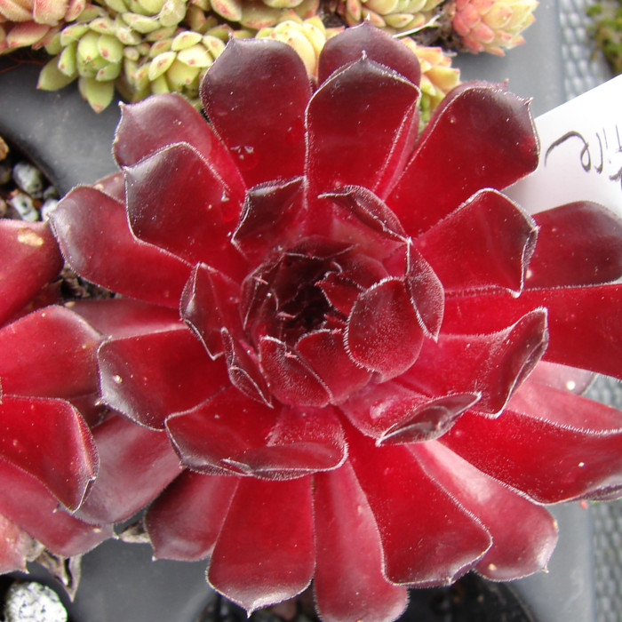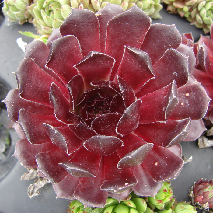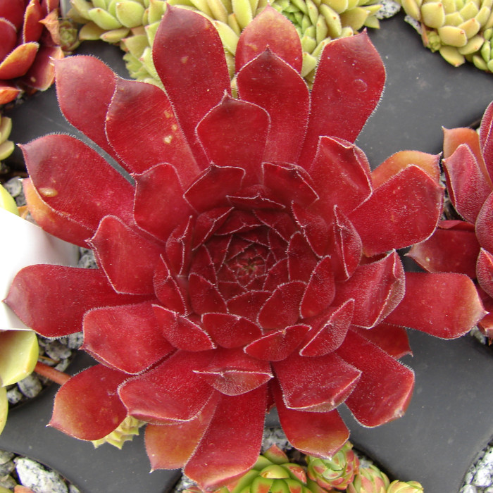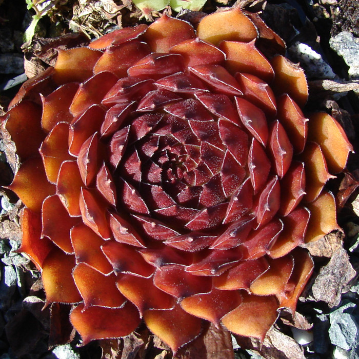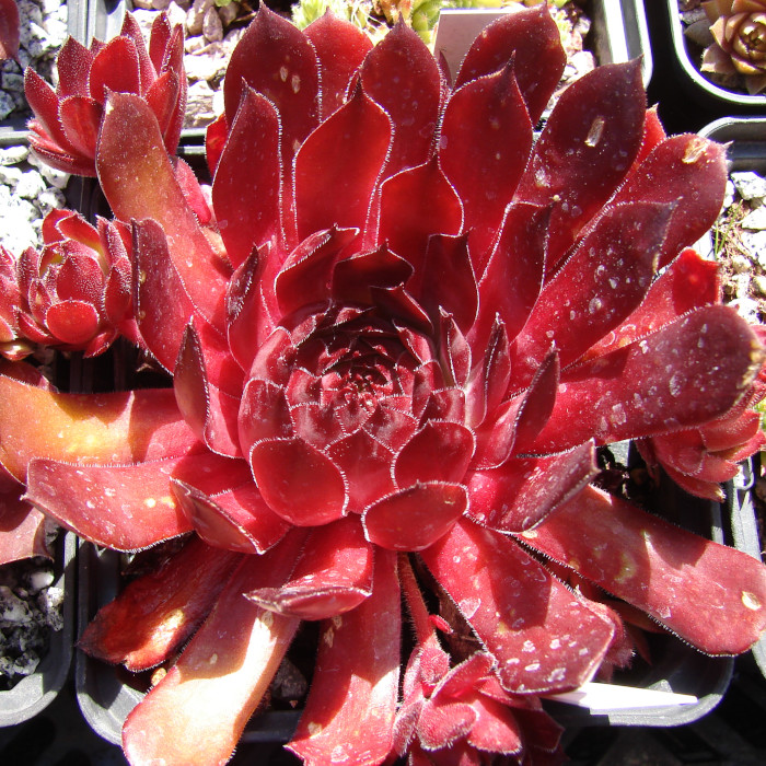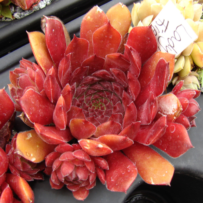 Eine recht neue und auch wüchsige Sorte mit großen Rosetten die sich während des ganzen Jahres in rötlichen Farben präsentieren. Während viele rote Hybriden im Sommer recht schnell verblassen, behält die "Dame des Feuers" ihre Färbung und mischt sich dann mit orangen Tönen. Der Name ist daher gut gewählt.