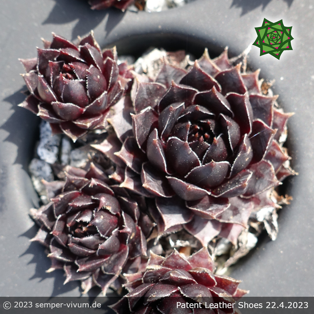 Eine neue Sorte von Kevin Vaughn aus den USA. Wir haben sie gleich im ersten Jahr unserer Pflege ins Herz geschlossen. In den Frühjahrsmonaten April und Mai zeigt die komplette Rosette von mittlerer Größe eine nahezu schwarze Färbung. Die Blätter sind dabei glänzend und wirken gerade zu dieser Zeit tatsächlich ledrig. Im Juni legt sich ein wachsartiger bläulicher Hauch auf die inneren Blätter der Rosette. Später insgesamt eher rosarot und zum Herbst dann mit Olivgrün und Violett gemischt. Die "Patentierten Lederschuhe" sind bestimmt eine aufregende Neuheit für alle Liebhaber der dunklen Hauswurz Sorten.