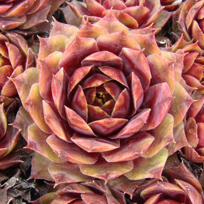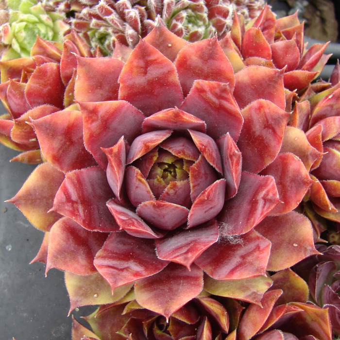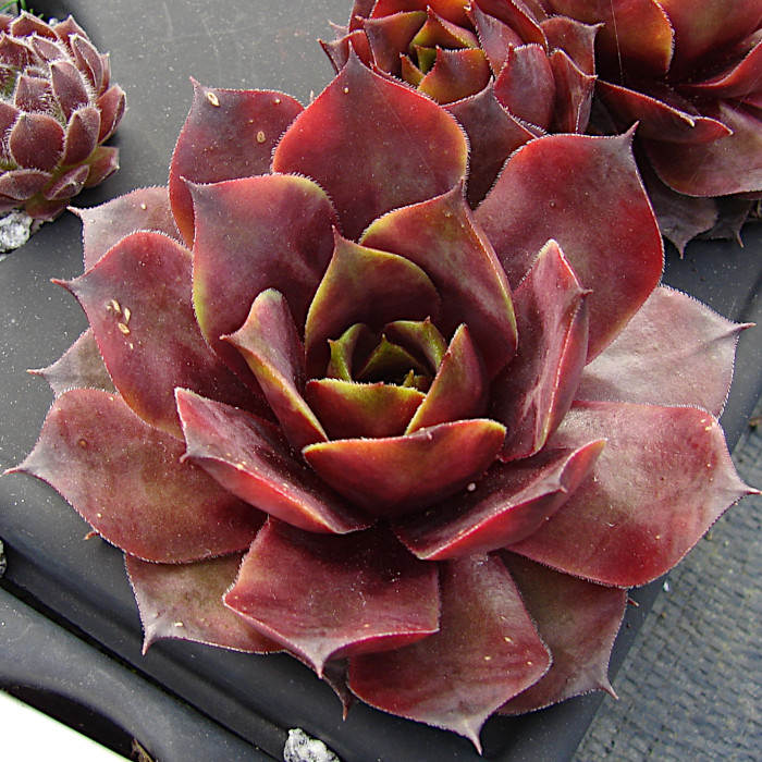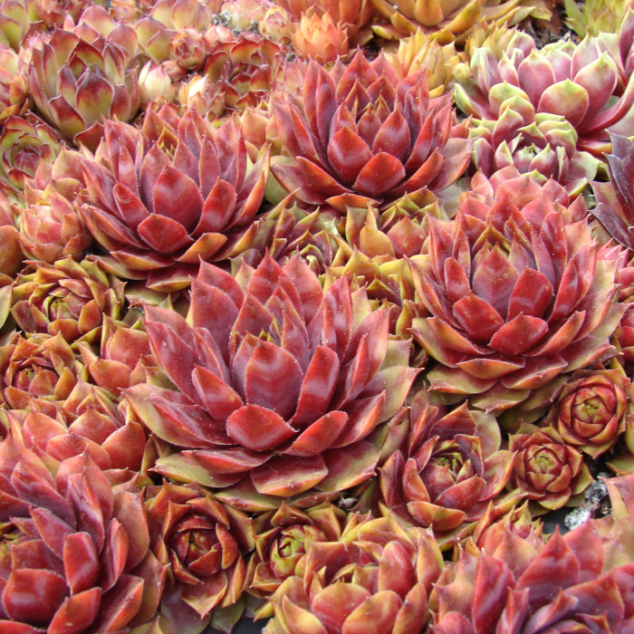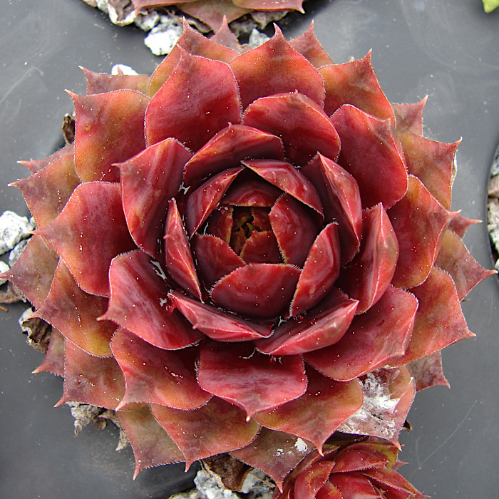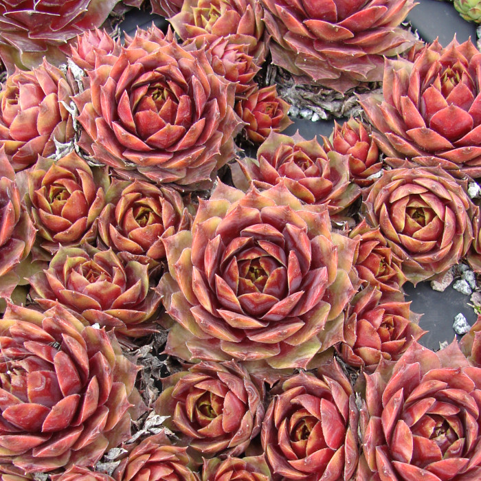 Ein belgischer Kultivar mit etwas außergewöhnlich geformten Rosetten. Sie besitzen im zeitigen Frühjahr relativ wenig, doch dafür umso breitere Blätter. Die dunkle Frühlingsfärbung verwandelt sich zum Sommer in Orange und Ocker. Besonders bei Sonnenschein eine bunte Erscheinung und bislang noch selten anzutreffen. Sie erhalten 1 kräftige Tochterrosette.