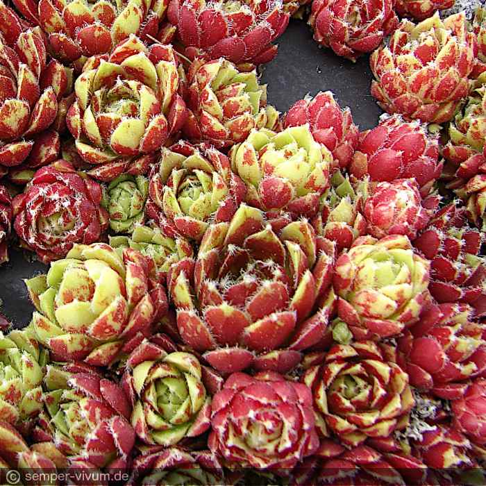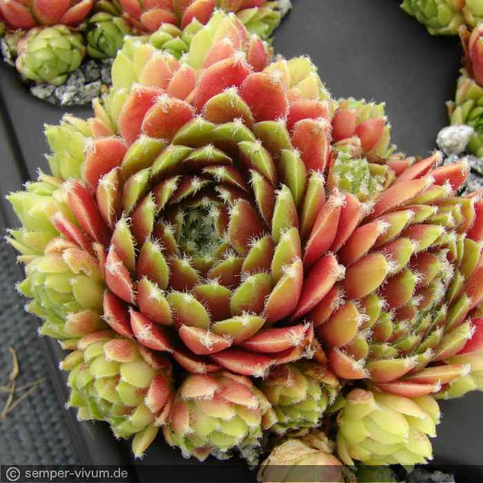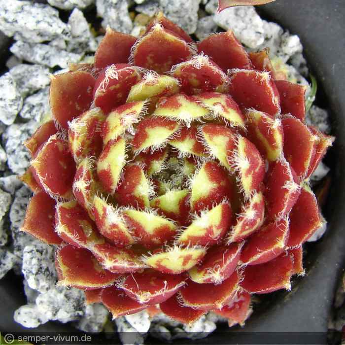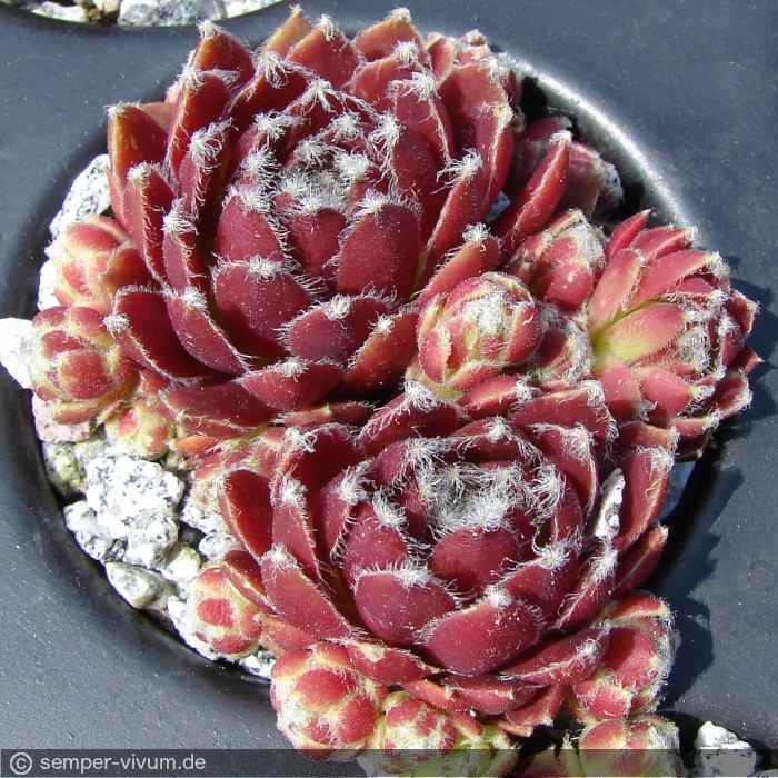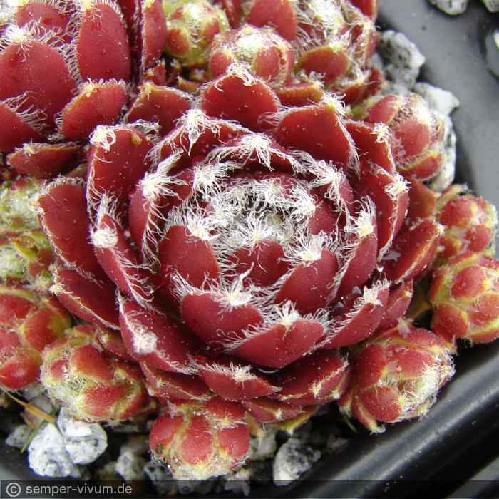 Die belgische Sorte formt kompakte Polster mit rötlichen Rosetten mit bräunlichen Nuancen. Die Spitzen sind mit einem kontrastreichen, weißen Wattebüschel versehen. Im Frühsommer wechseln die Farben zu Rosa mit hellgrünem Zentrum. Vor allem im Mai sehr interessant wegen der fleckigen Blätter.