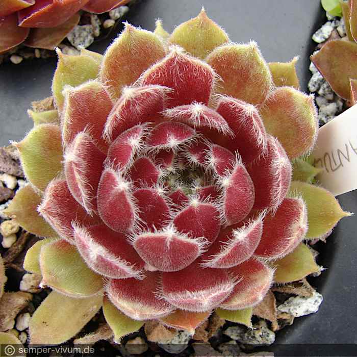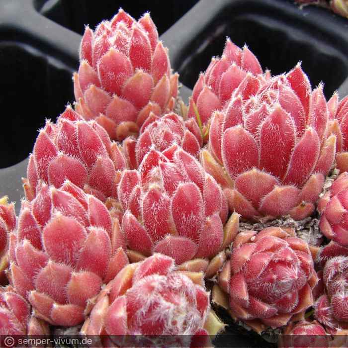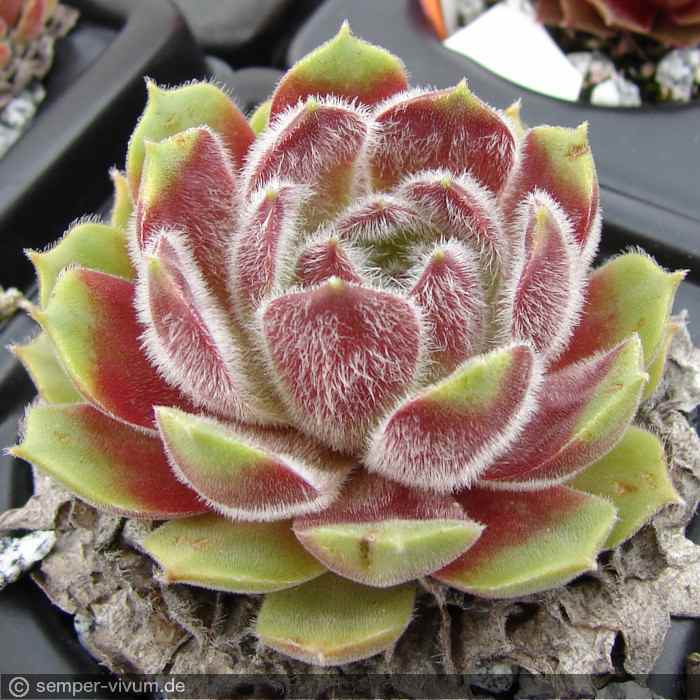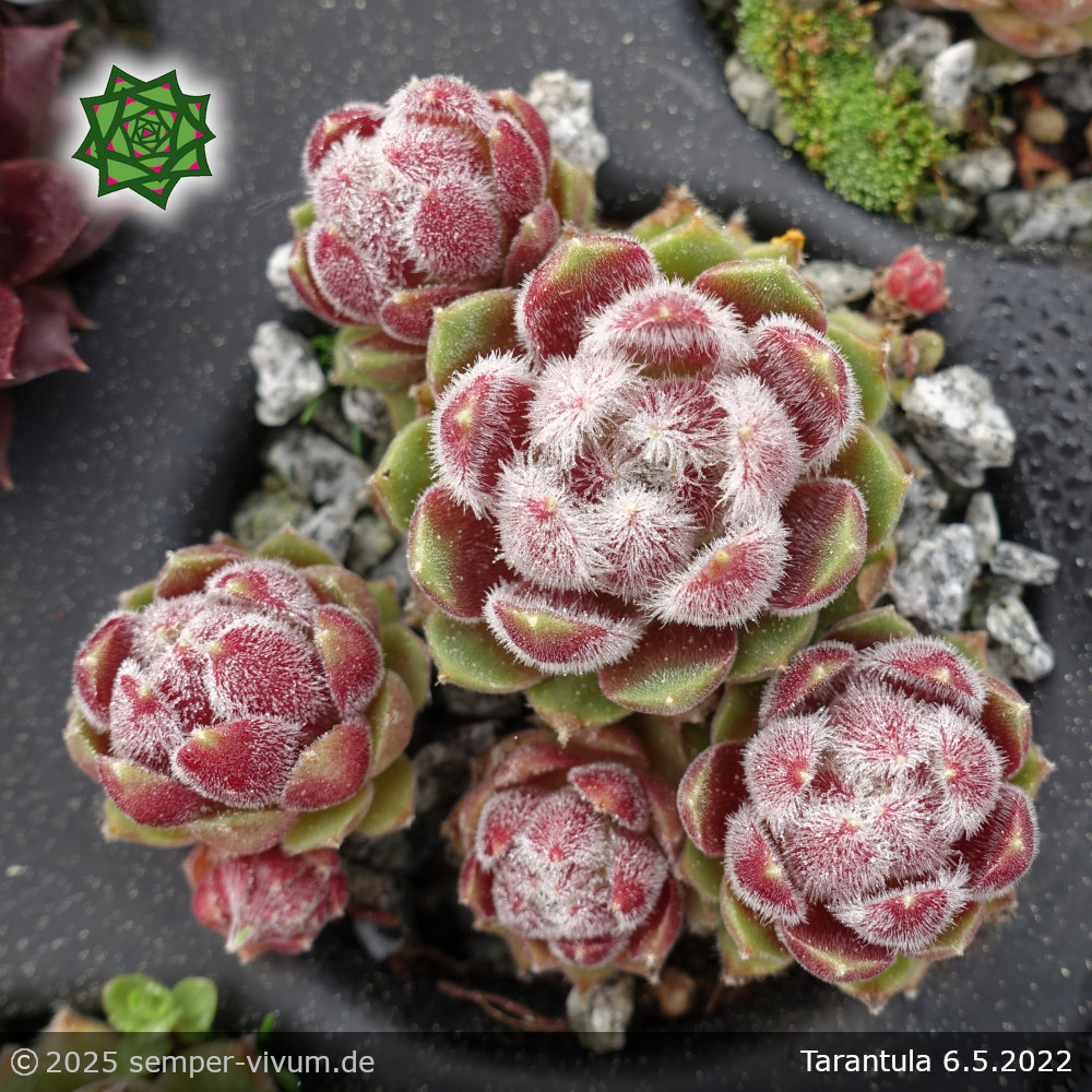 Die Sorte 'Tarantula' ist sicherlich eine der schönsten Züchtungen von Sue Thomas aus Großbritannien. Die samtenen Blätter der mittelgroßen Rosetten sind am Rand und besonders auf den aufgesetzten Laubspitzen mit zahlreichen längeren weißen Härchen besetzt. Den Namen finden wir sehr passend. Besonders auffallend ist die unterschiedliche Färbung der einzelnen Blätter während der Sommermonate. Ein Muss für jede Sammlung!
