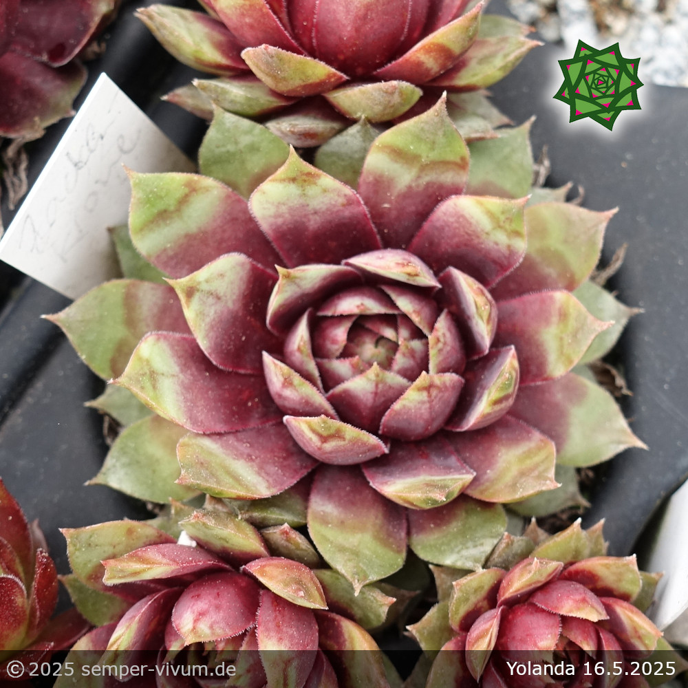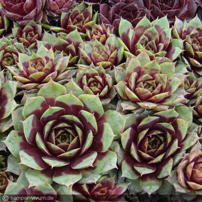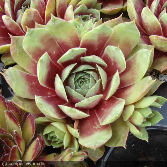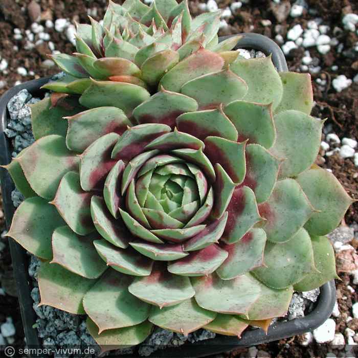 Große, jadegrüne Rosetten, deren Blätter im Frühling an der Basis in kontrastreiches dunkles Bordeauxrot getaucht sind. Es besteht auffallend große Ähnlichkeit zum Zufallssämling 'Buntstachel'.Sie erhalten je nach Größe zwei bis drei Tochterrosetten.