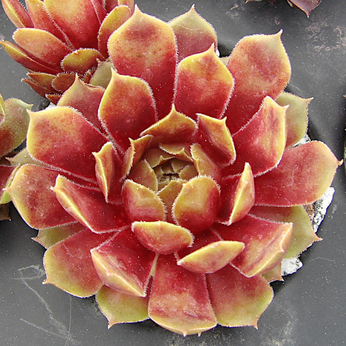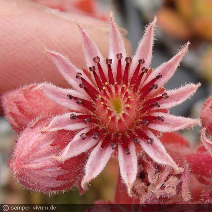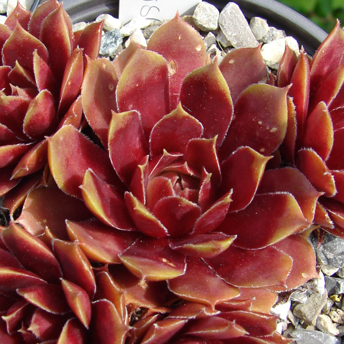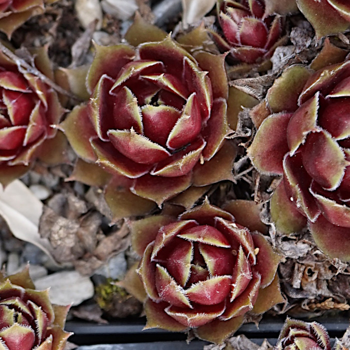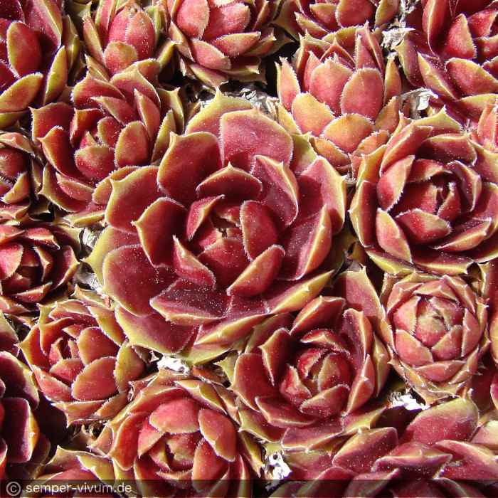 Eine zauberhafte Neuheit von diesem Jahr aus unserem Lande von einer lieben Sammlerin. Die 'Zauberrose' formt schöne, kompakte Polster und ist sehr gesund. Auch Hitze, Kälte und selbst Nässe konnten ihr keinen Schaden zufügen. Die letzten Jahre waren für so manche Sorten nicht einfach zu überdauern. Am schönsten ist sie im zeitigen Frühjahr, wobei auch die Form ins Auge springt. Dazu der farbliche Kontrat, einfach prächtig! Im Mai ändern sich die Farben in Karmin- bis Himbeerrot mit Karamell. Während des Sommers heller, bis sie im Herbst goldgelb leuchtet. Die Auslese stammt aus einer Saatgutmischung aus dem Sortiment von semper-vivum.de, so sind wir nicht ganz unschuldig