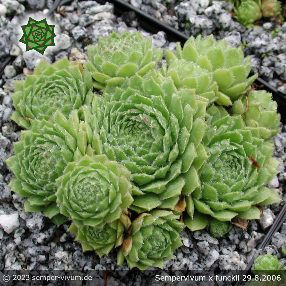 Eine Naturhybride von S. arachnoideum mit S. montanum und S. tectorum. Sie formt dichte Polster aus vielen kugeligen Rosetten, deren Blütenstände im Frühjahr auffallend große rosarote Blüten öffnen.