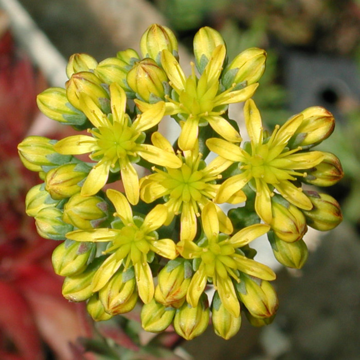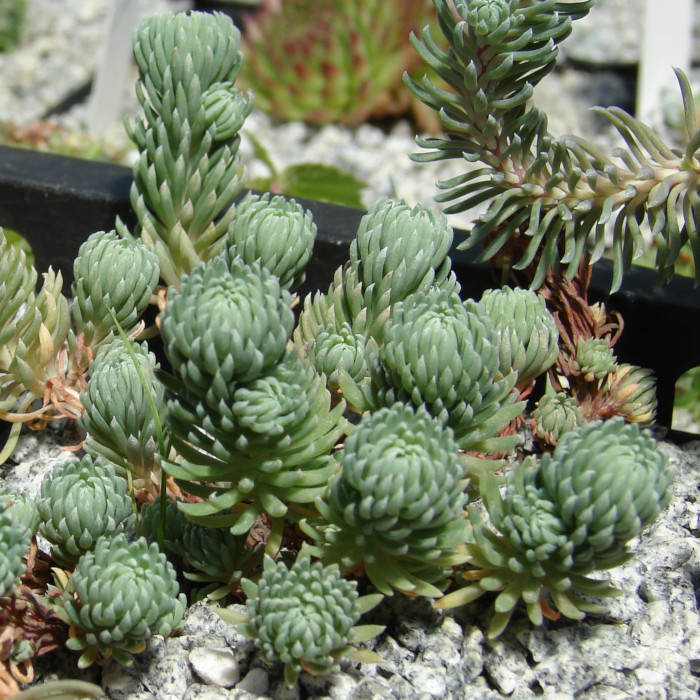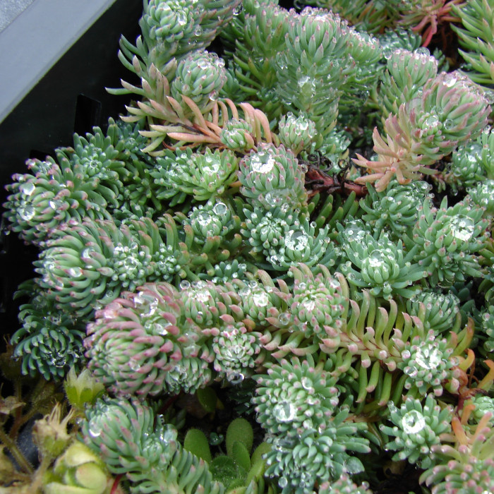 Eine europäische Art mit bläulich grünem Laub – die Blätter ähneln den Spitzen von Fichtenzweigen: Nadelförmig und an der Spitze gekrümmt. Wir erhielten diese Art auch schon als Sedum "Glasmurmeln". Die knospigen Blütenbälle mit ihren gedrehten Blütenblättern erinnern bei genauem Betrachten tatsächlich daran!
