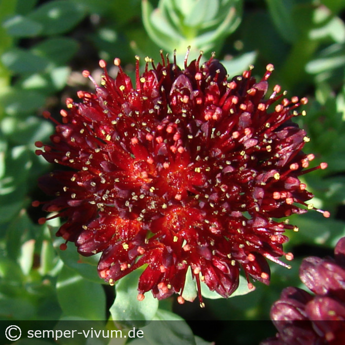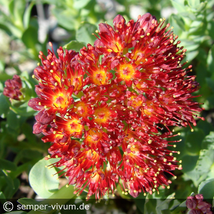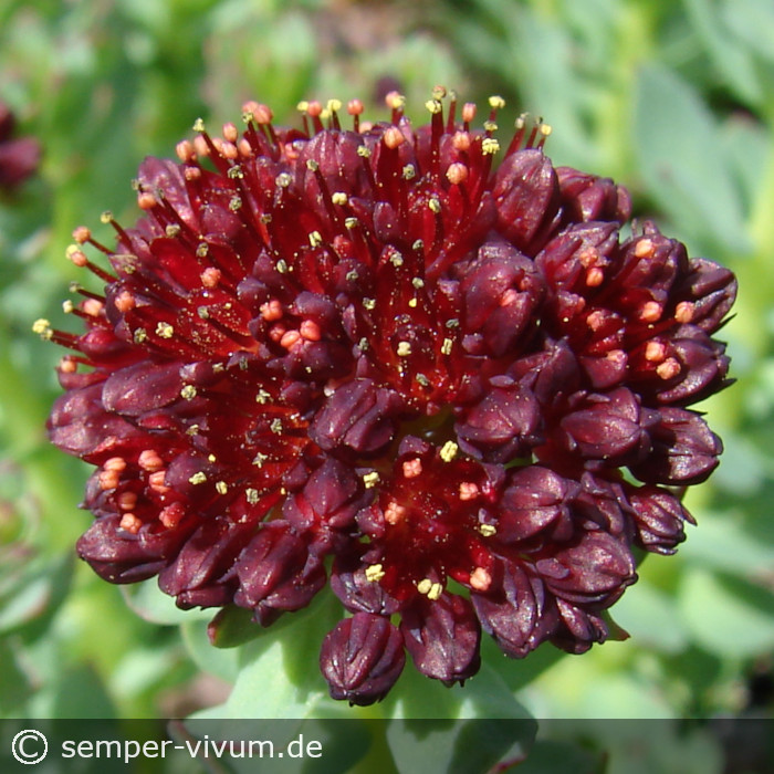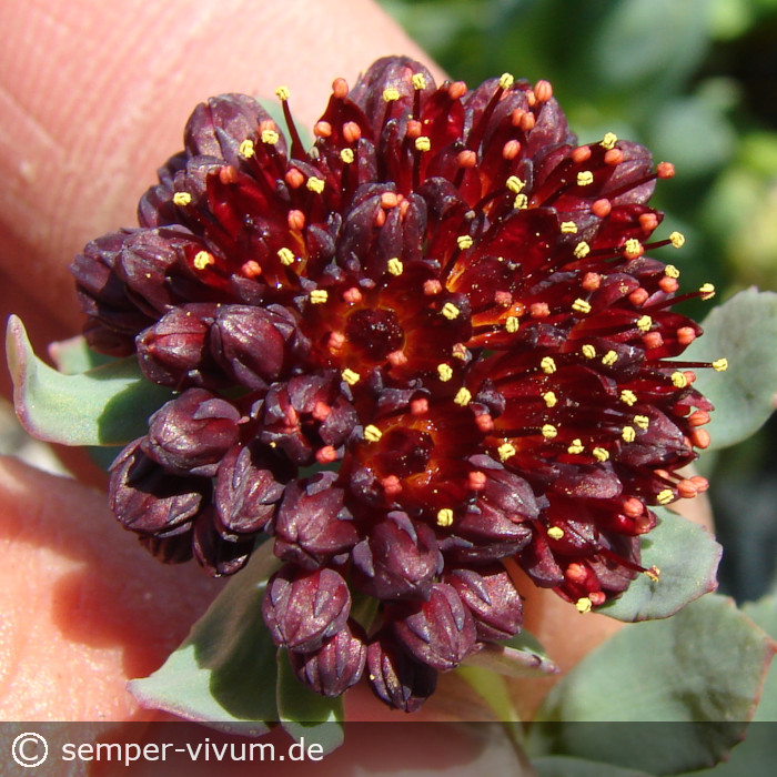 Es ist ein Sämling von Rhodiola integrifolia 'Atropurpureum', den wir jetzt bereits seit 10 Jahren für Sie vegetativ vermehrt haben. Diese Art wurde früher als Varietät von Rhodiola rosea angesehen. Die Wuchsform ist ähnlich, die Blätter eher grün und die Blüten normalerweise karminrot gefärbt (Abb. 4). Unsere Auslese öffnet jedoch recht dunkle rubinrote Blüten (Abb. 1 bis 3) und hat dann wiederum auffallend blaugrünes Laub. Sie erhalten eine kräftige Pflanze im 8cm Vierkanttopf.